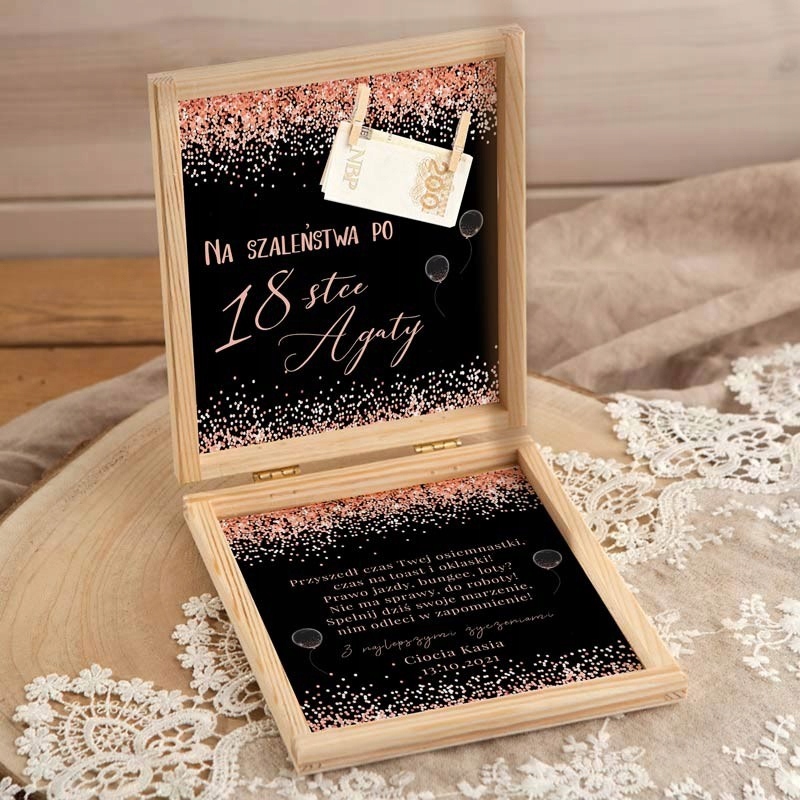 Копилка на 18 лет, благодаря которой можно элегантно подарить деньги. Внутри карты имеются клипсы для самостоятельного размещения наличных и красивая графика цвета розового золота черного цвета. Такая коробка – прекрасная альтернатива классическому конверту.