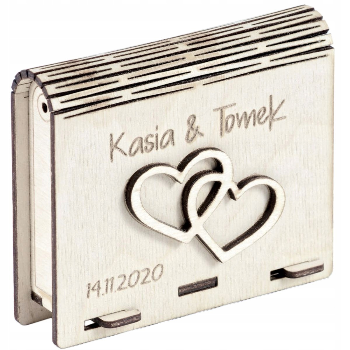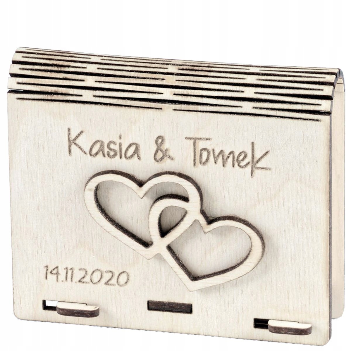 На обложке, в дополнение к твердого приклеованным сердцам, вы можете включить имена молодоженов и дату брака. Место по запросу. Гравировка сделана в лазерной технологии, благодаря которой она долговечна и эстетическая.