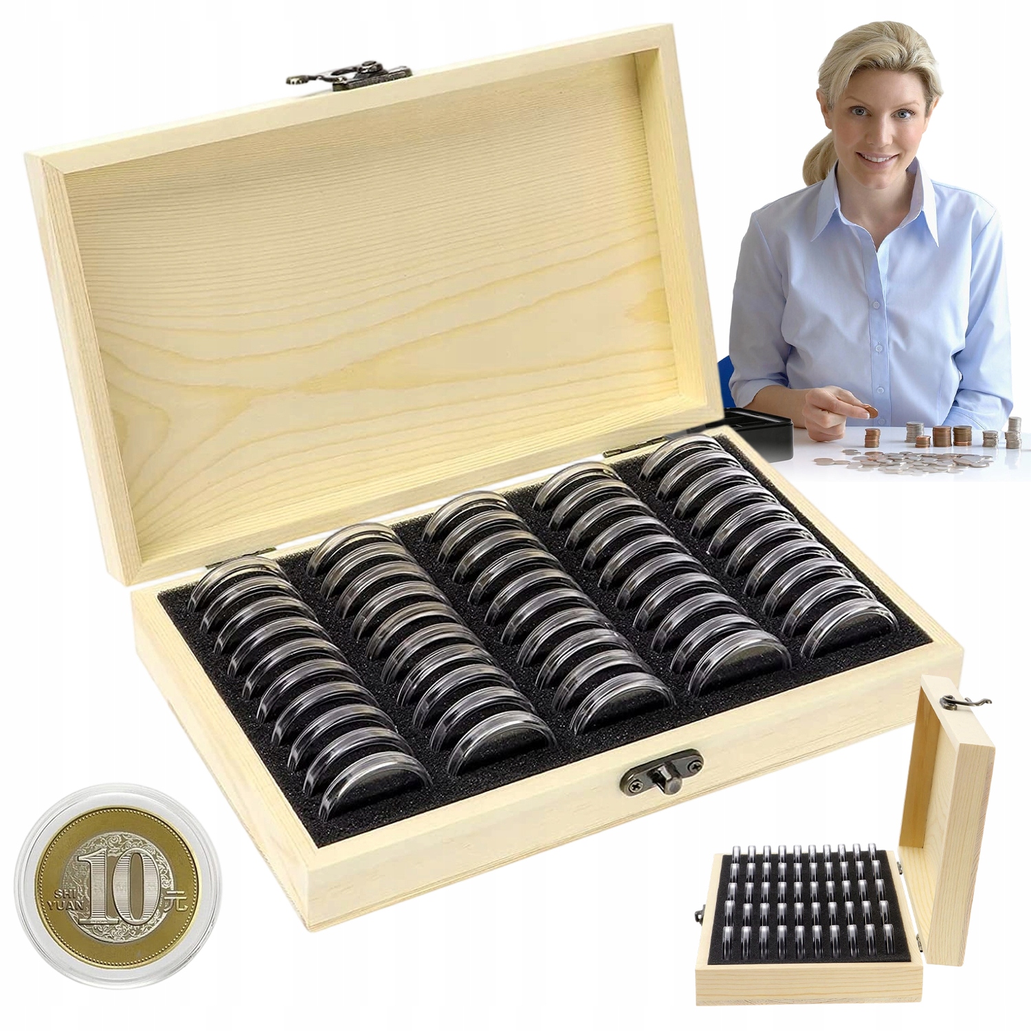 КОРОБКА ДЛЯ МОНЕТ ДЕРЕВ'ЯНА НУМІЗМАТИЧНА З 50 ПЛАСТИКОВИМИ КАПСУЛАМИ