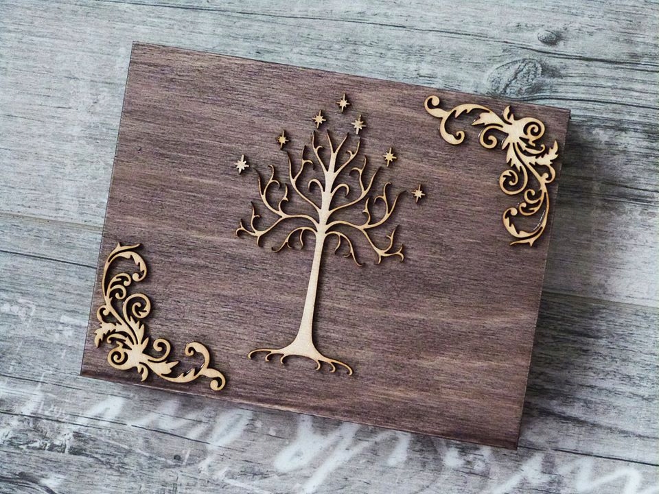 Продаем шкатулку для обручальных колец на заказ, окрашенную в цвет темного дерева (коричневый). Украшен декором (Древо Гондора / Тема из романа «Властелин колец»), углы натурального цвета и декор с именной гравировкой и цитатой внутри, а центр облицован мхом с добавлением вырезанных дисков. из дерева.