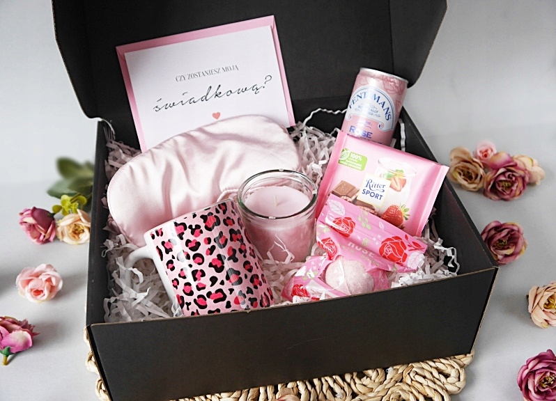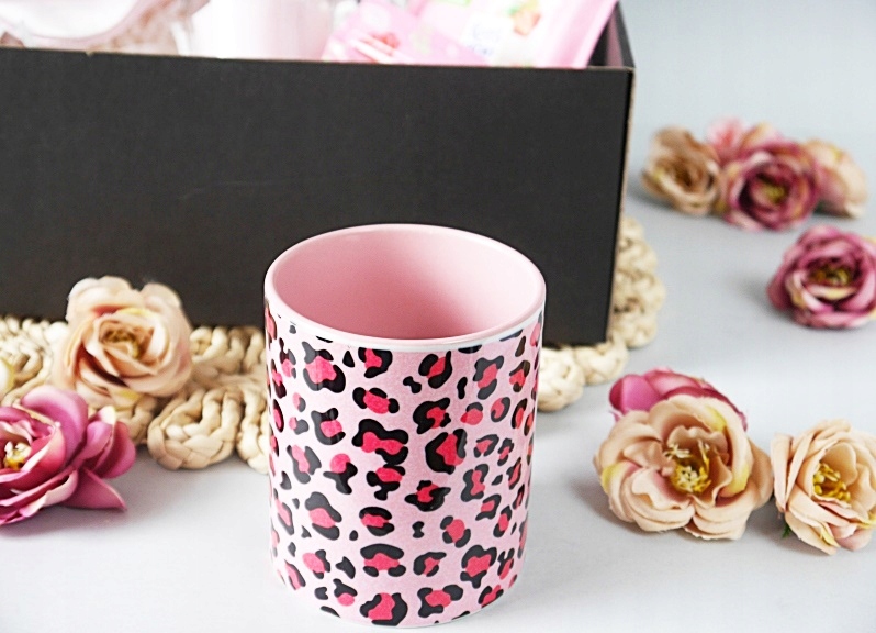 - в коробке: повязка на глаз, леопардовая кружка, розовая свеча, бомбочка для ванны, шоколад Ritter Sport, розовый лимонад.