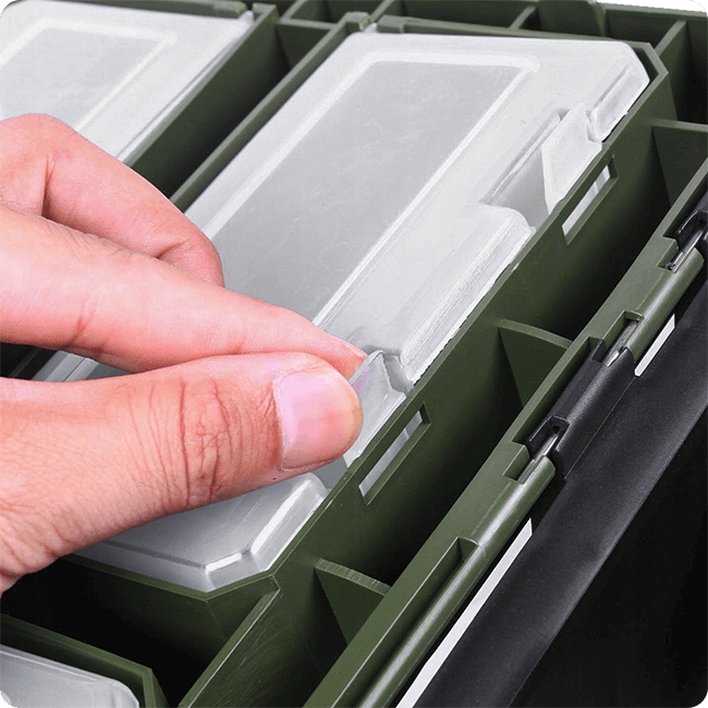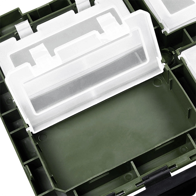 Крышка коробки оснащена четырьмя запирающимися ящиками, которые позволяют безопасно хранить небольшие аксессуары. Благодаря этому можно точно организовать крючки, наживки или другие мелкие элементы снасти. Запирающиеся ящики дополнительно защищают содержимое от погодных условий, что особенно важно во время дождя или сильного ветра.
