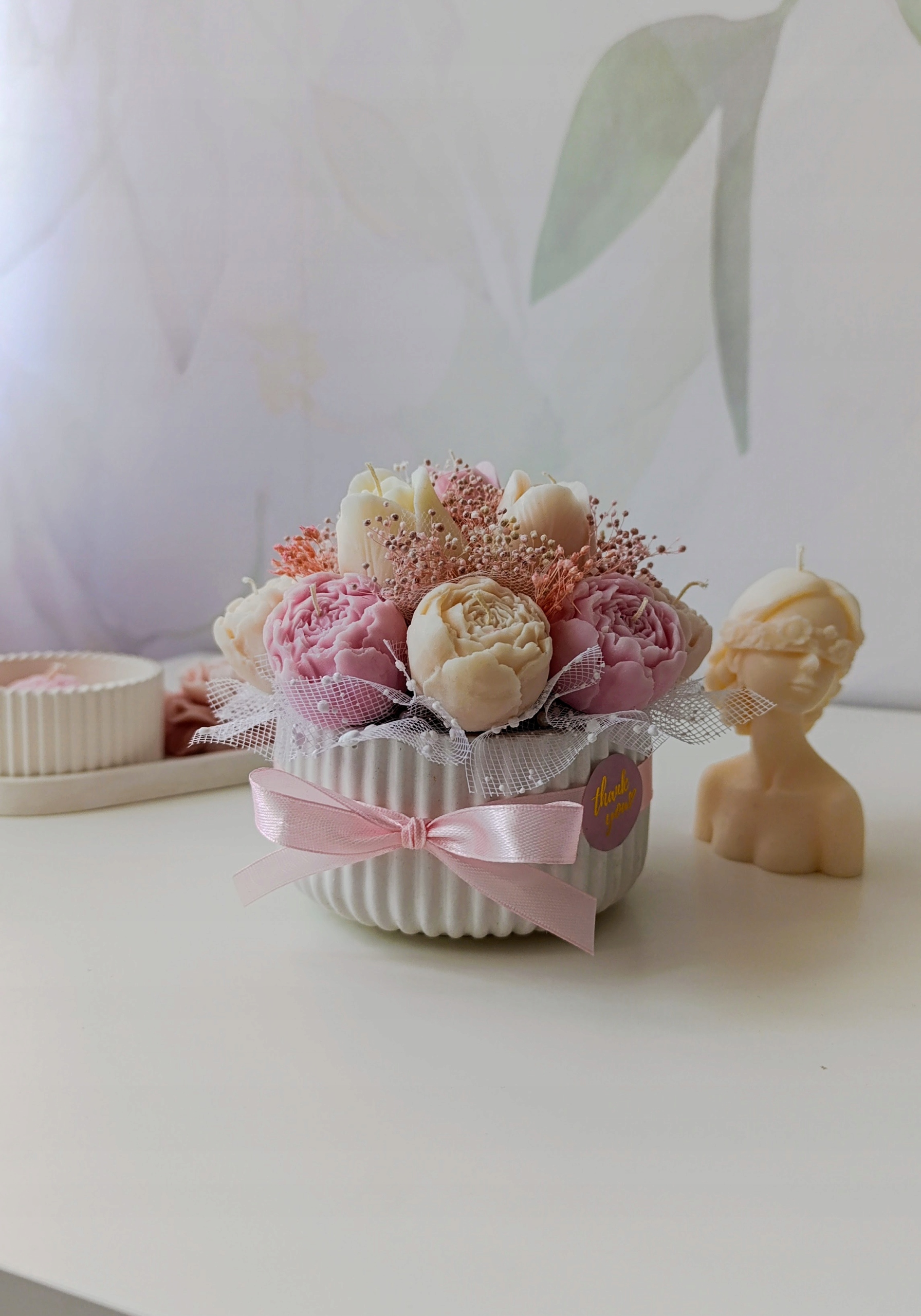 Коробка для свечей «Романтичный розовый». Это не обычная свеча или букет. Это роскошное украшение, сочетающее в себе элегантность рифленого гипсового сосуда с нежностью цветов розовых оттенков. Идеально подходит, чтобы выразить свои чувства или подарить себе момент изысканного расслабления.