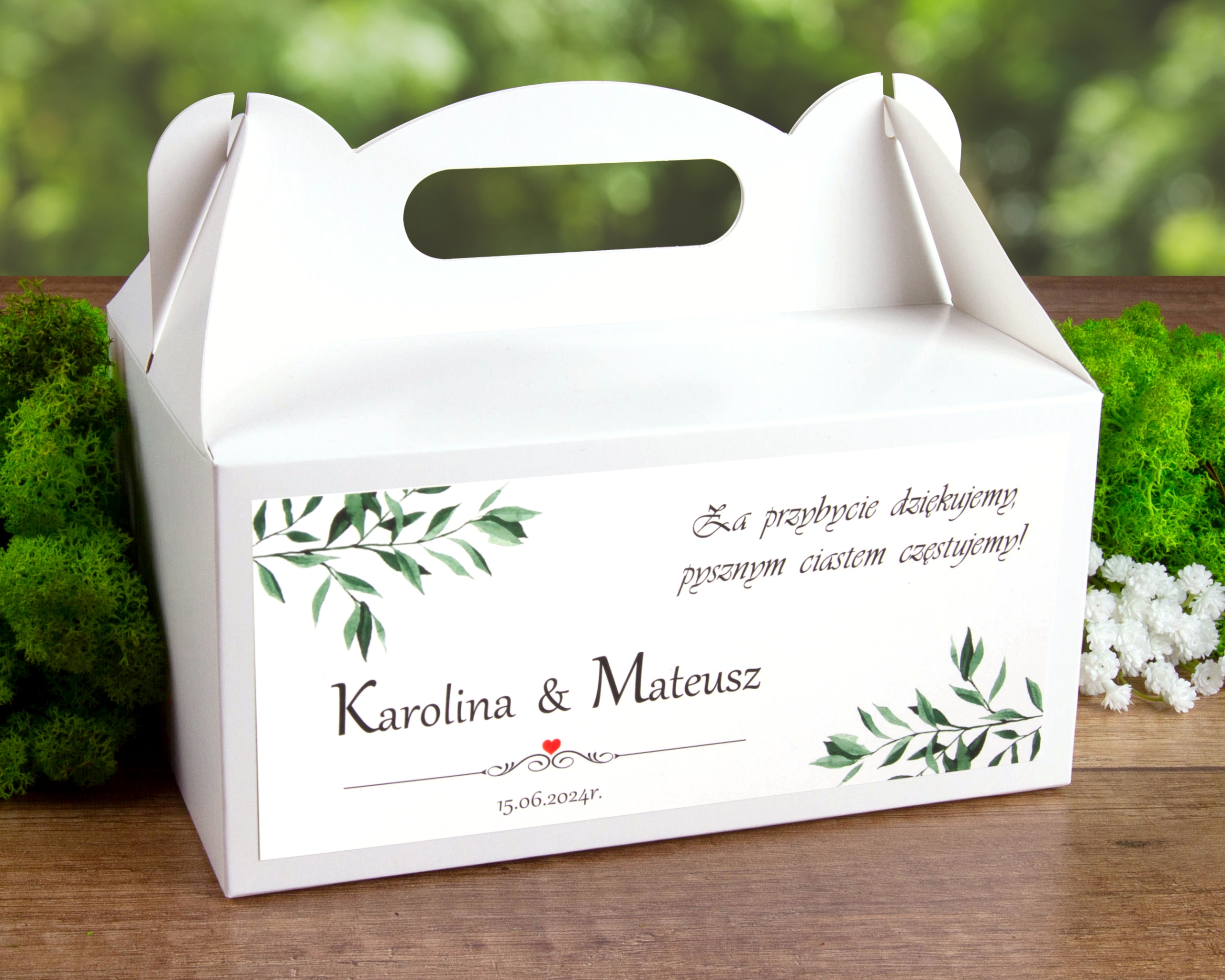 Коробка в нашем предложении изготовлена из белой бумаги с дополнительным декоративным принтом с именами невесты и жениха и дату торжества.