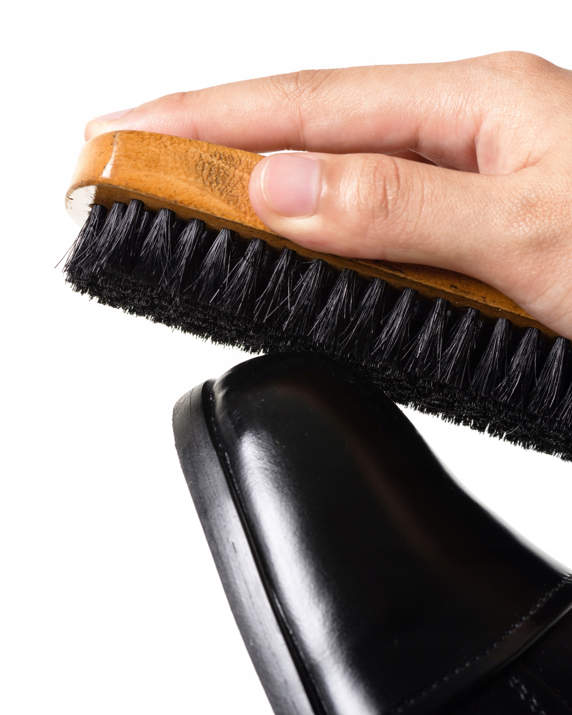 Щетка изготовлена из конского волоса, что обеспечивает высокое качество и эффективность чистки и полировки обуви и кожаных аксессуаров.