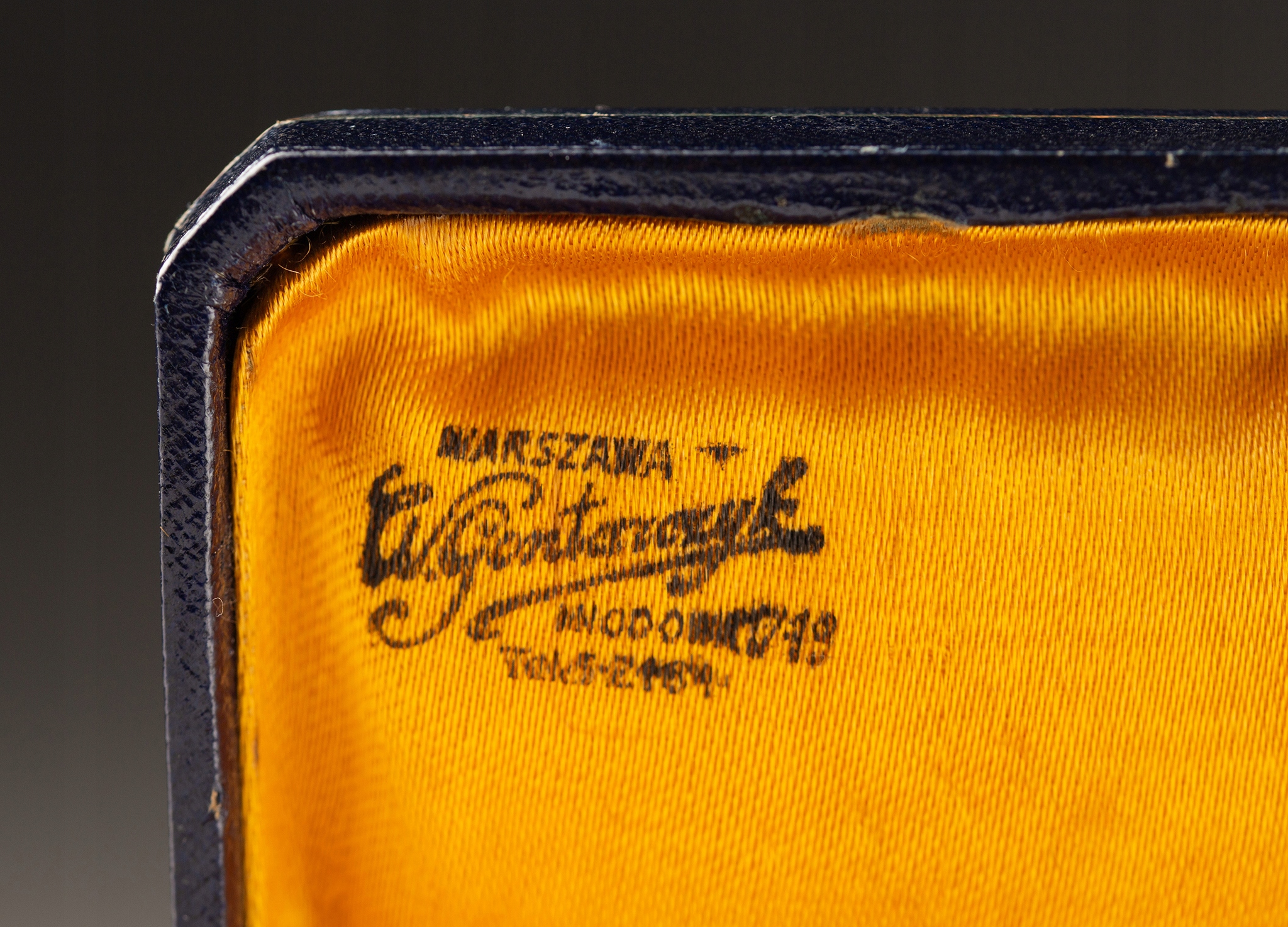 Предмет аукциона — оригинальная эксклюзивная шкатулка для офицерского полкового значка от фабрики Виктора Гонтарчика. Коробка прямоугольной формы со слегка скошенными углами, обтянута темно-синей кожей, внутри имеется отверстие под гайку диаметром 27 мм (большую гайку). Внутри штамп с подписью изготовителя: «Варшава | В. Гонтарчик | Медова 19».
