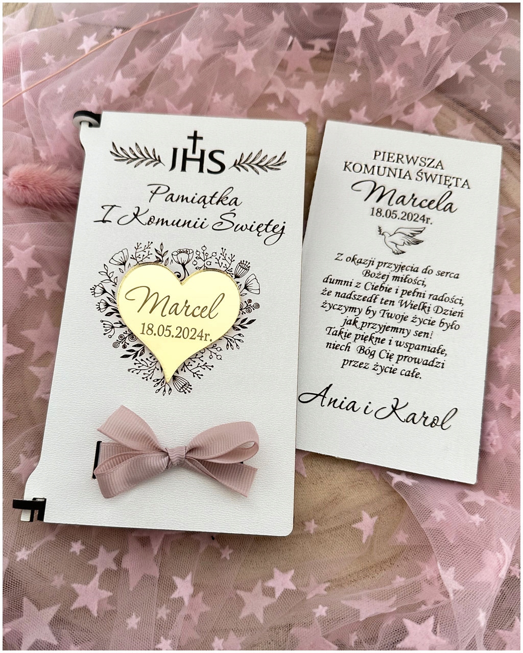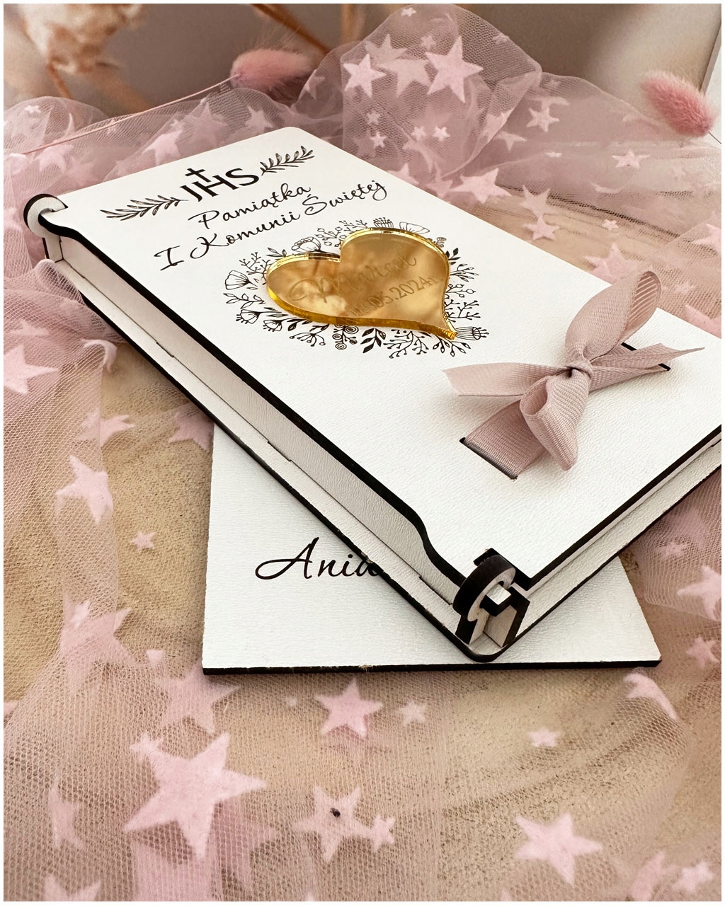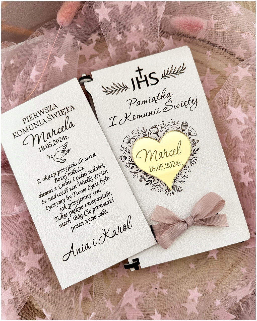 сувенир святого причастия в форме оригинальной box - уникальная идея для дара по случаю первого святого причастия . Продукт изготовлен из деревянного и золотого зеркального сердца и красивой ленты общения . Ящики в середине зеркального сердца Название ребенка выгравировано и Дата церемонии