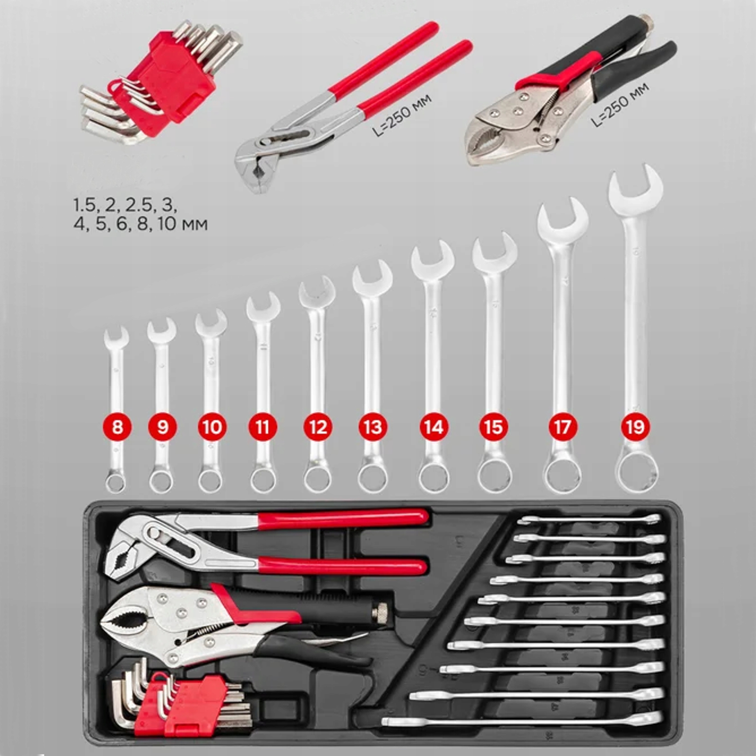 Этот набор набора посвящен типичной механической и гидравлической работе. Ключи с плоским онком, изготовленные из Cr-V, чрезвычайно прочные, а дополнительные плоскогубцы и клавиши Allen увеличивают универсальность набора.