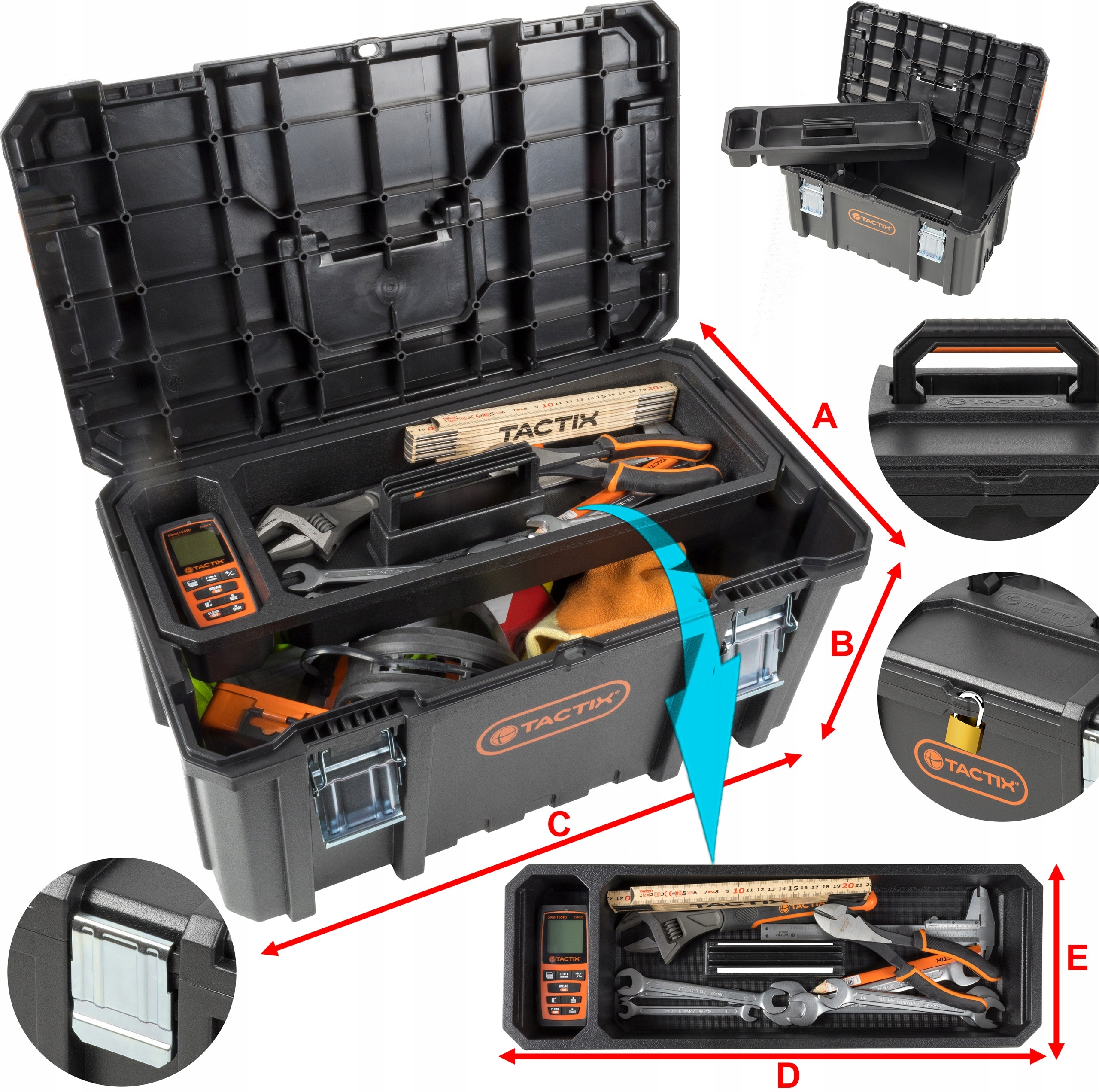 Ящик для инструментов благодаря встроенной складной нескользящей ручке легко переносить , даже с тяжелым содержимым. В большом грузовом отсеке можно разместить инструменты длиной около 50 см, и если нам не нужно все содержимое ящика в данный момент, мы можем перевезти только некоторые предметы в одном съемный лоток с ручкой.