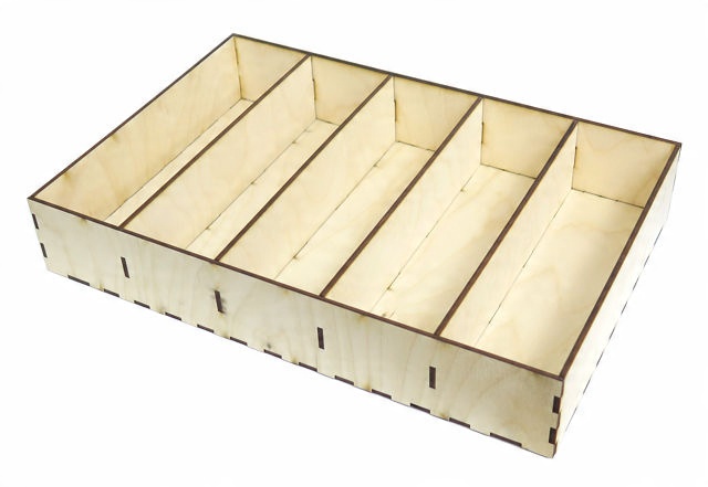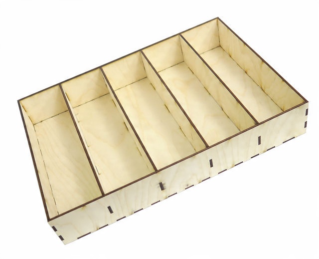 Ящик из фанеры толщиной 3 мм с 5 отделениями с внешней размеры: 31,8x21,2x5,5см.
