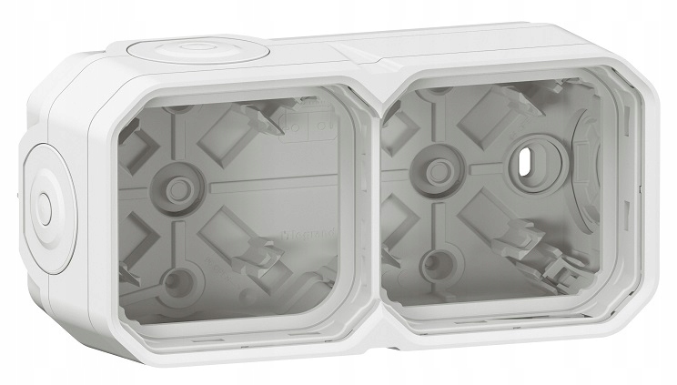 Двойной короб Plexo для поверхностного монтажа, водонепроницаемый, с мембранной втулкой, позволяет установить все функции Plexo на поверхность стены. Его конструкция позволяет подавать кабели снизу, сверху, сбоку или сзади. Для использования в помещении или на открытом воздухе.