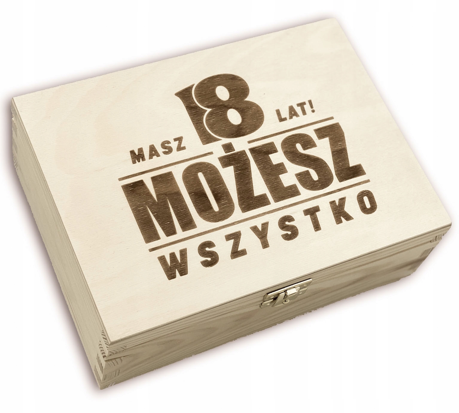Красивая шкатулка с гравированными предметами первой необходимости, наполненная древесной шерстью. Это идеальная идея подарка на 18, 20, 30, 40, 50, 60, 70-летие.