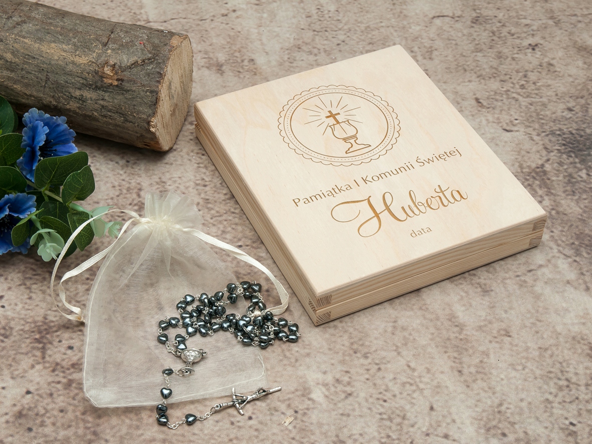Сувенир Первого Причастия - легкая шкатулка из натурального дерева с красивыми четками в форме сердца в красочном мешочке из органзы.