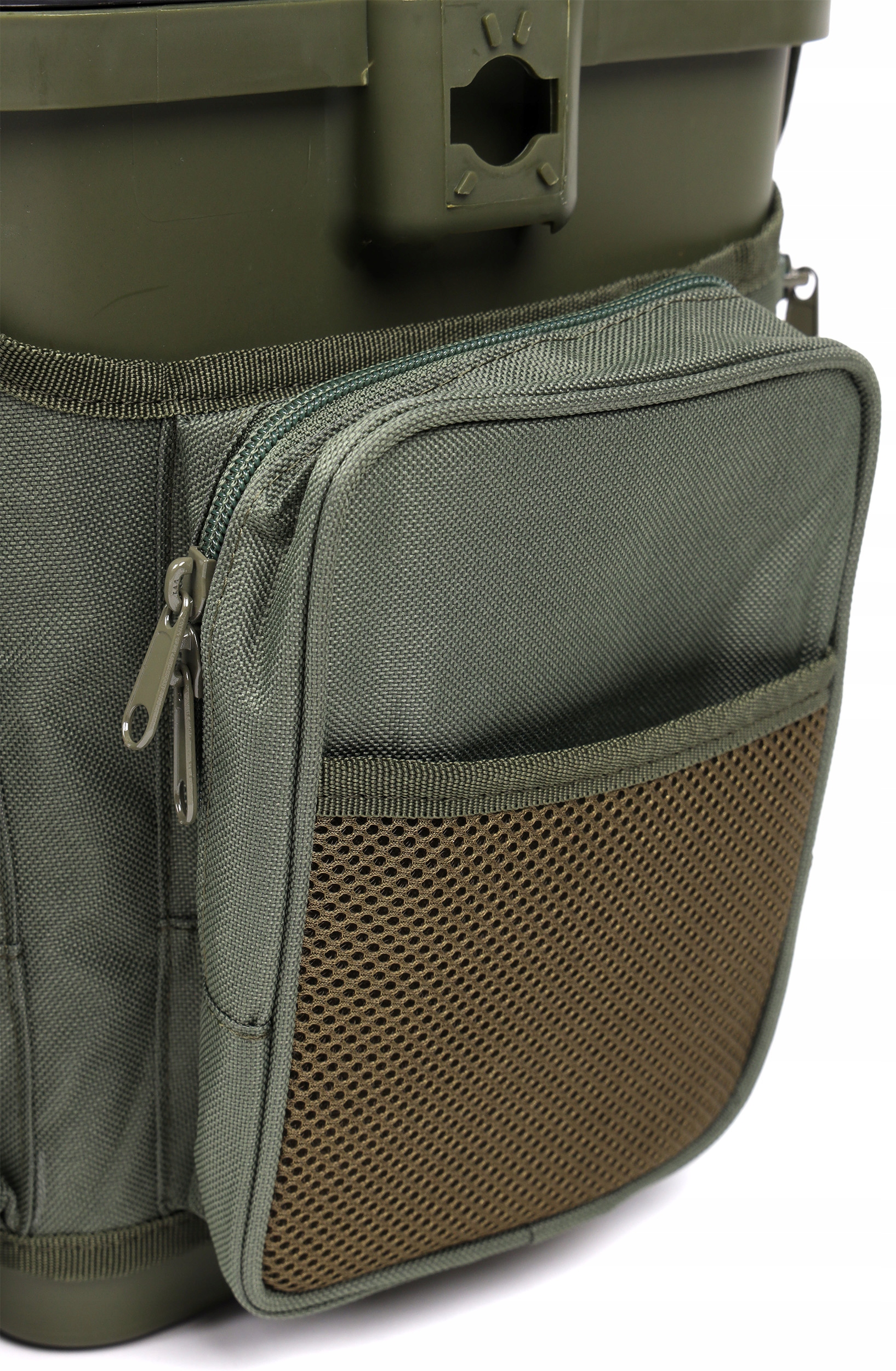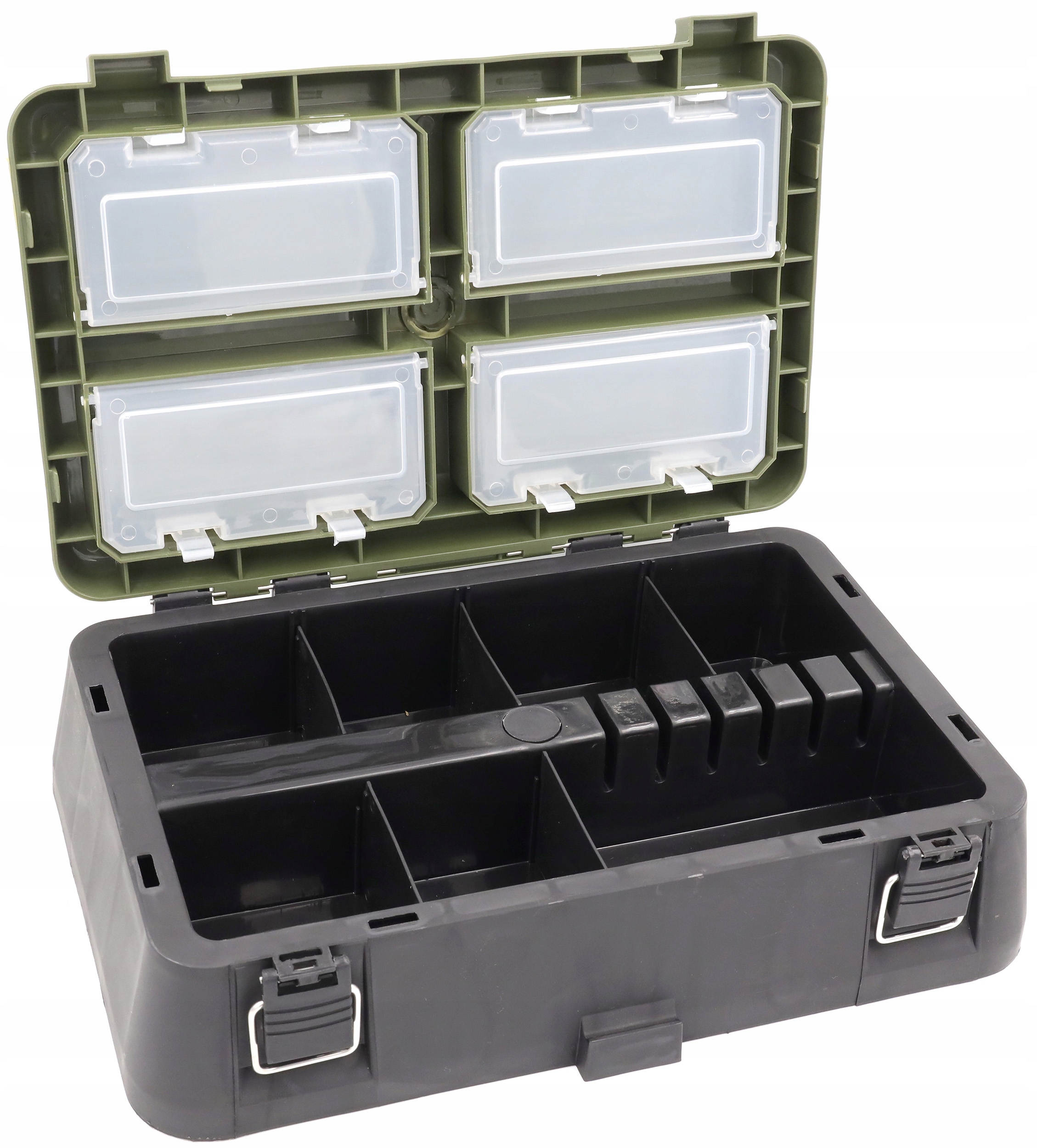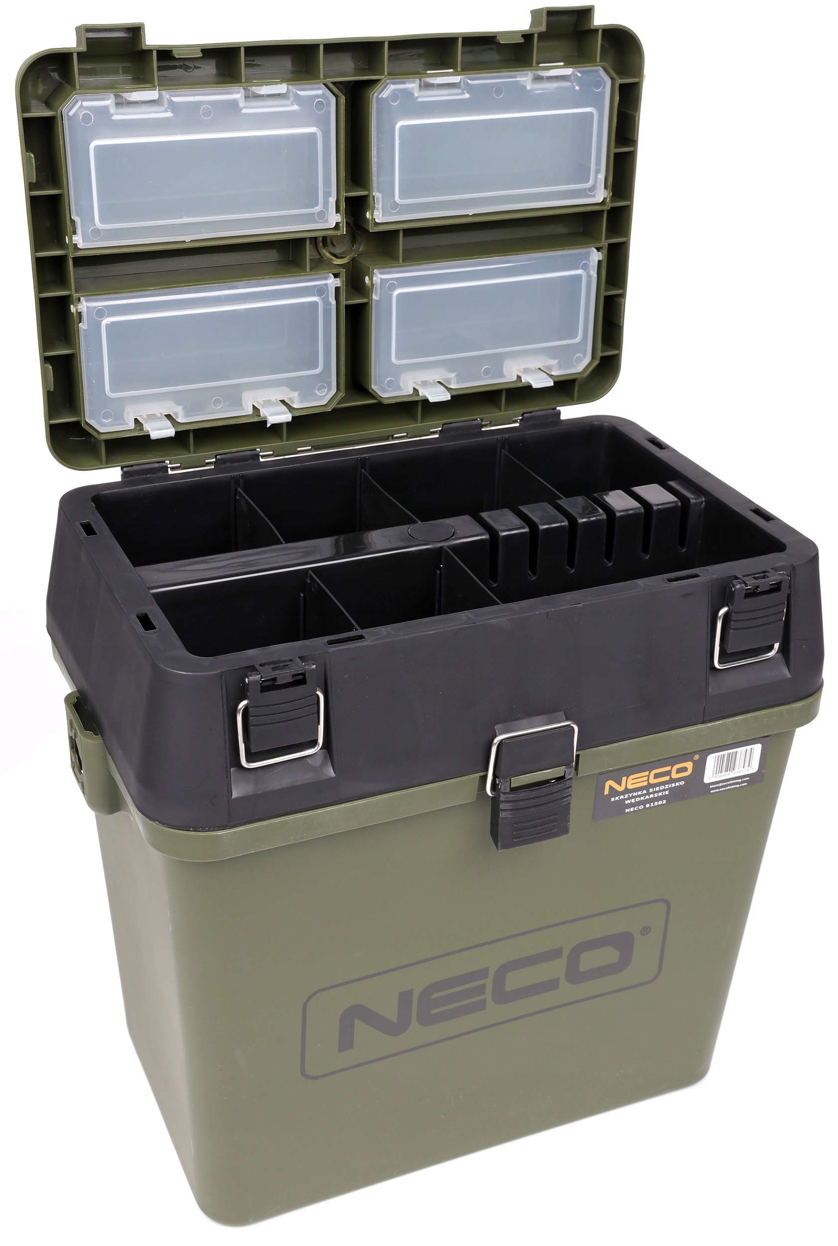 Ламинатный, морозостойкий рыболовный ящик с поролоновым сиденьем. Поднимающаяся вверх створка содержит четыре закрывающихся на защелки ящика для мелких рыболовных снастей и приманок, а в нижней части крышки расположены кассеты с отсеками для аксессуаров среднего размера.