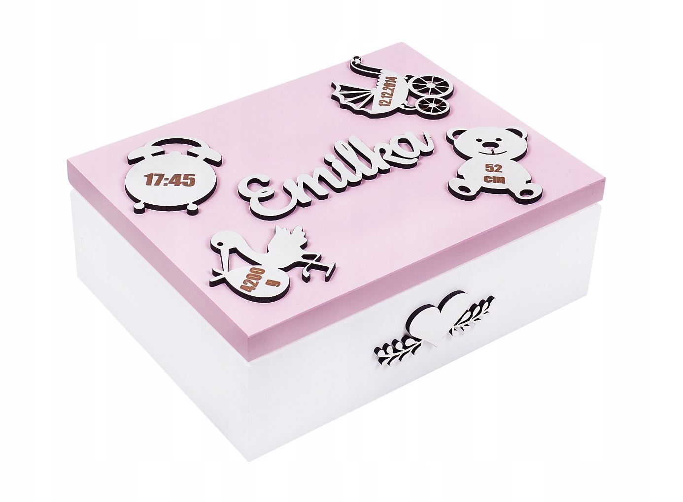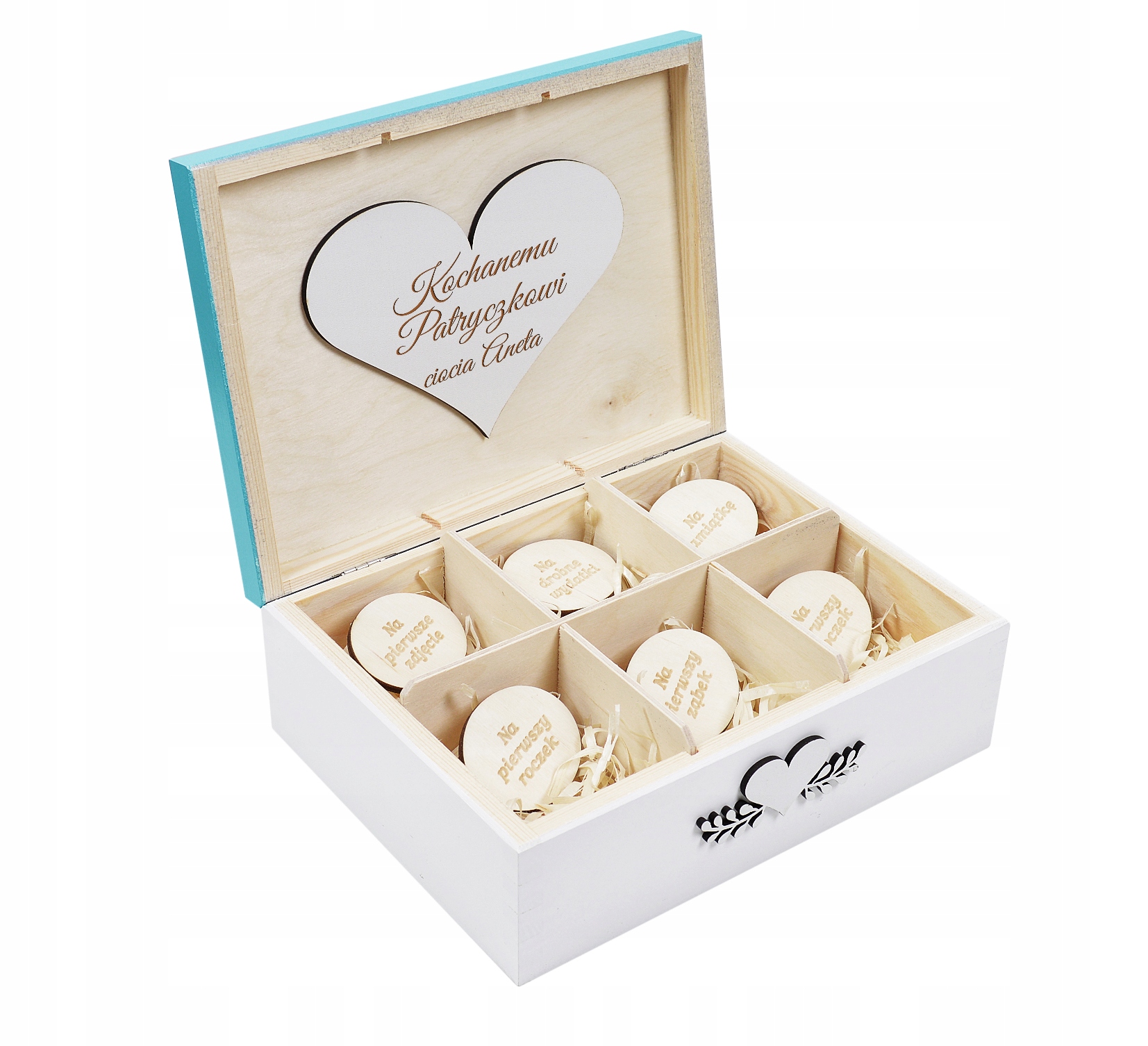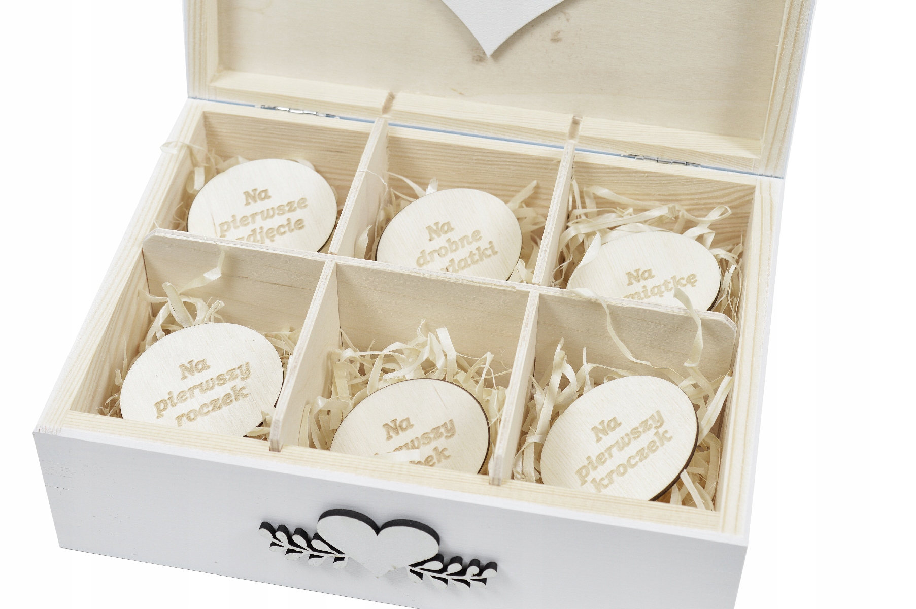 На аукционе ниже мы представляем вам вечную и чрезвычайно красивую деревянную коробку с воспоминаниями. Это идеальное предложение для подарка для рождения ребенка, года, дня рождения или в качестве сувенира крещения. Специальные отсеки с деревянными колесами с гравировкой помогут вам выбрать уникальные подарки. Входящие входящие характеризуются выпуклыми приклеенными элементами с гравированной записью, которая определенно восхищает родителей Крусинки.