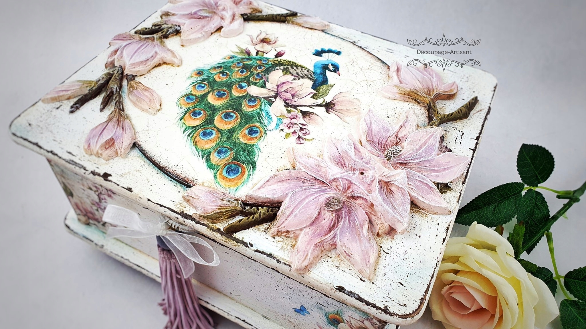 Коробка изготовлена из массива МДФ. Он не требует предварительного измельчения, что значительно облегчает работу с этим продуктом. Идеально подходит для декорирования в технике декупаж и микс-медиа.