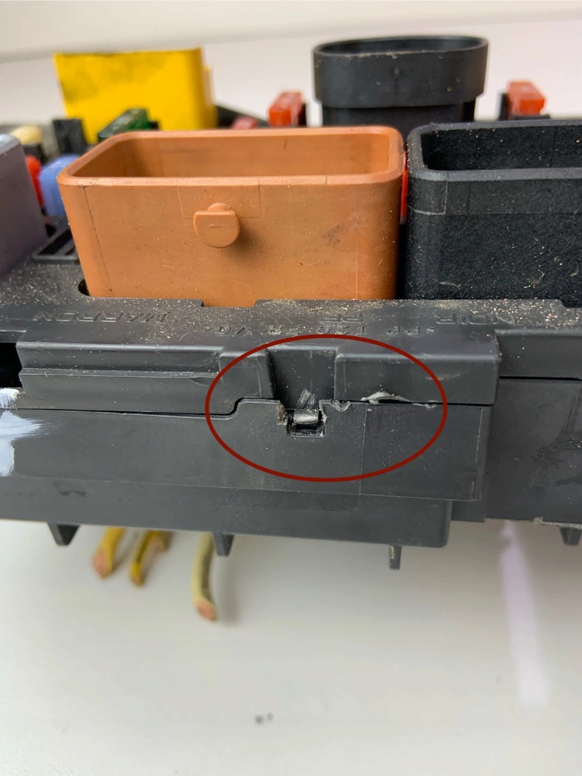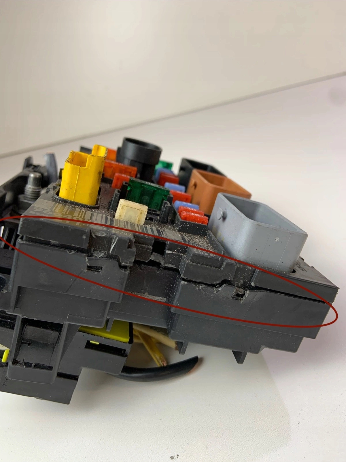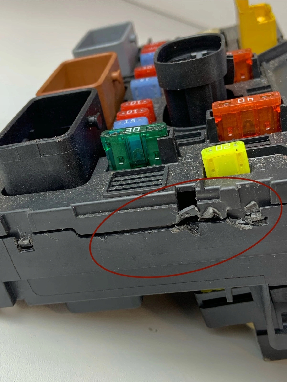 имеет сломанное крепление правой стороны, верхняя часть корпуса выделяется снизу, повреждение в корпусе на соединениях, сломанные крепления задних предохранителей, показанные на изображениях