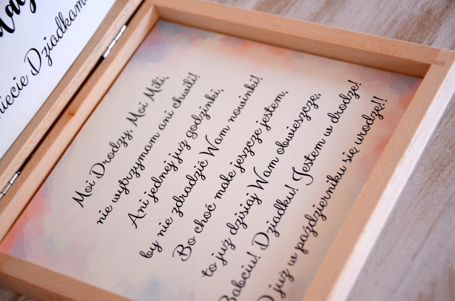 - Принт на верхней части коробки (УВАЖАЕМЫЙ РОДИТЕЛИ, ВЫ СТАНЕТЕ БАБУШКОЙ И ДЕДУШКОЙ, ДОРОГАЯ МАМА, ВЫ СТАНЕТЕ БАБУШКОЙ, ДОРОГОЙ ПАПА, ВЫ СТАНЕТЕ ДЕДУШКОЙ)