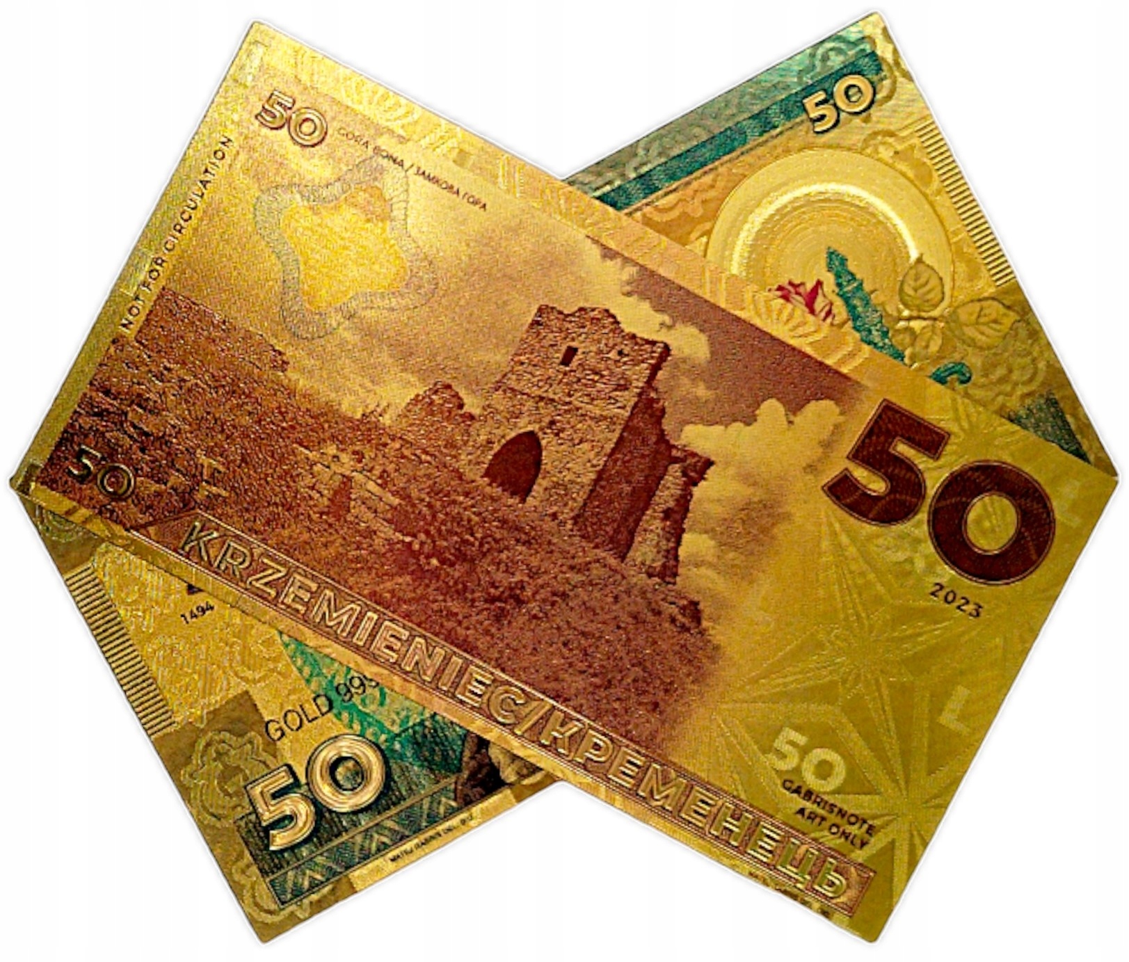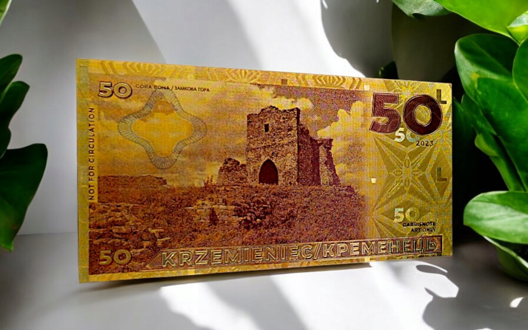 Точная копия коллекционной банкноты, изготовленная из ПВХ и покрытая золотой фольгой.