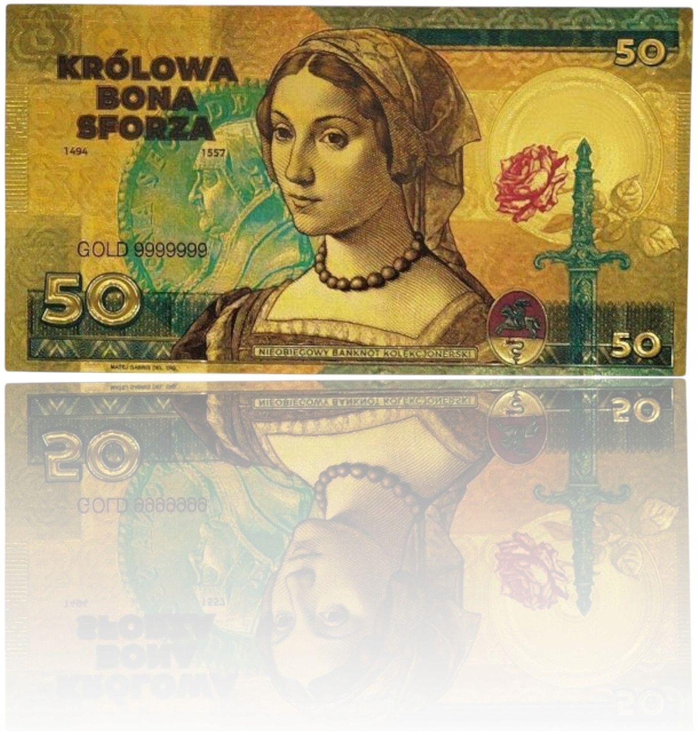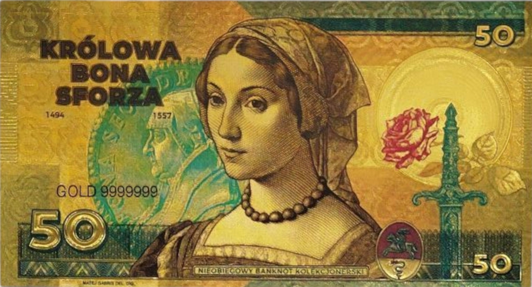⭐Позолоченная художественная коллекционная банкнота из ПВХ, вдохновленная историческим образом королевы Боны Сфорца (1494–1557) – женщины, которая навсегда изменила польскую политику, культуру и экономику.