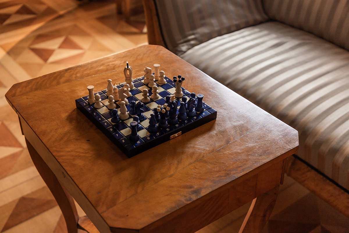 Шахматные фигуры были выведены из дерева с ручным дополнением к деталям (например, грива в прыгунах). Высота короля около 65 мм.