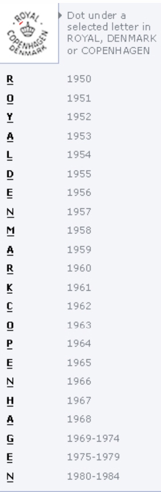 Три волны по -прежнему окрашены в каждую фарфоровую проекцию, созданную на Королевской фабрике Копенгагена. Другая часть подписи - Королевская корона, символизирующая происхождение компании. Первоначально корона была нарисована вручную, но с 1870 -х годов этот знак был создан благодаря поднусоченному прикату. Корона дополнительно украшена «Крестом Дагмара», взорванной дорогими средневековыми камнями с распятием, обнаруженным в 1690 году.