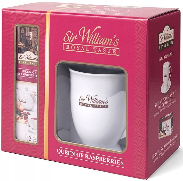 В него входит фарфоровый заварочный набор (кружка 400 мл, крышка, блюдце). и упаковка из 12 штук чая Sir Williams Royal Queen Of Raspberry. Все упаковано в элегантную упаковку.