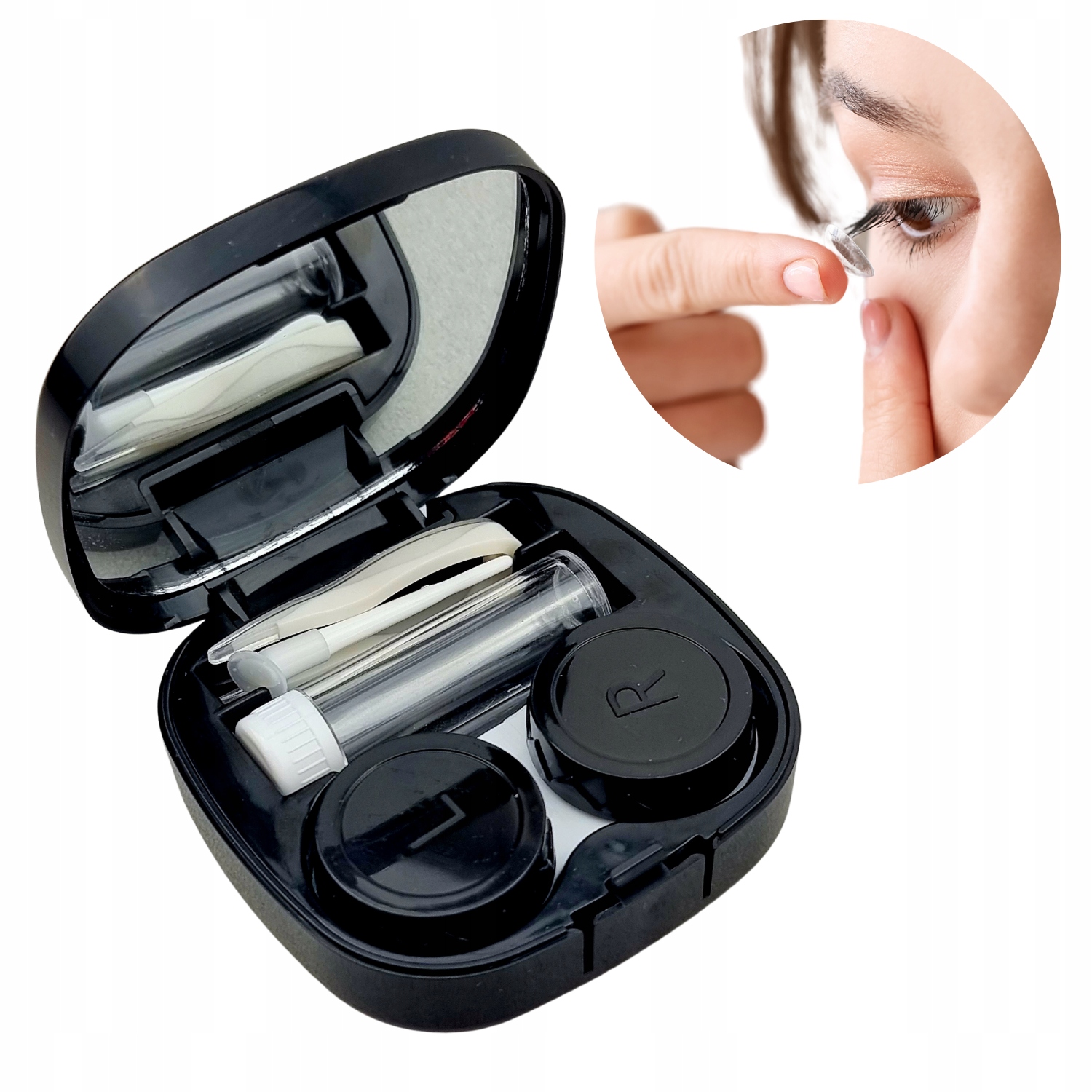 Квадратный органайзер имеет компартменты для отдельных элементов набора, кроме того, крышка построена -ин зеркало , которое будет способствовать установке и удалению линз. Закрыт защелкой , которая защищает содержание от случайного открытия.