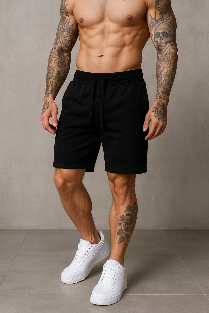 КОРОТКИЕ СПОРТИВНЫЕ ШОРТЫ МУЖСКИЕ ИЗ ХЛОПКА - ЧЕРНЫЕ - СТРУНА L