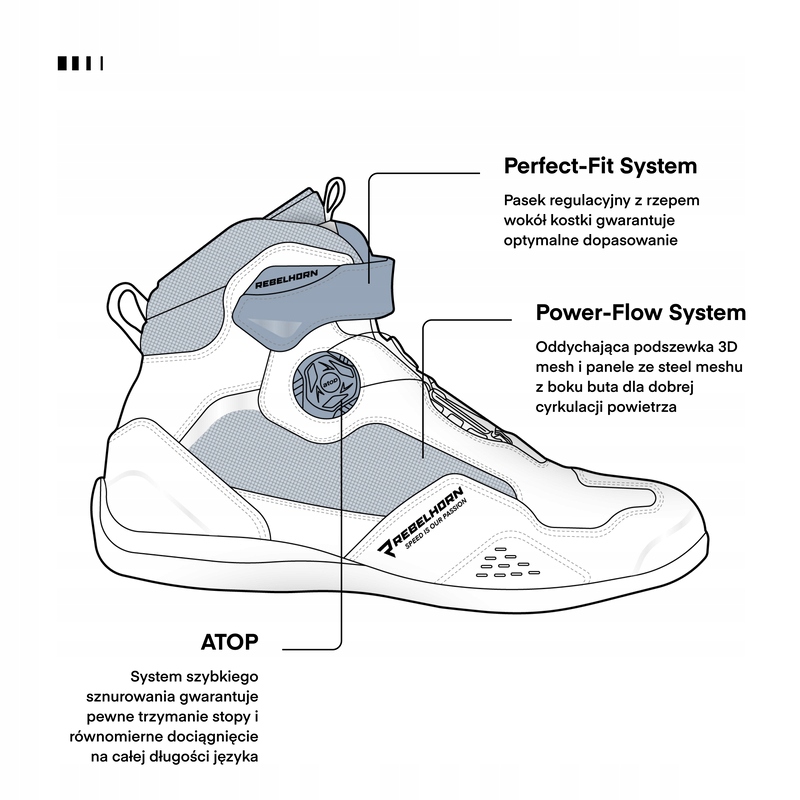 Rebelhorn Spark II - это короткие городские мотоциклетные туфли со спортивным персонажем . Они имеют быструю систему регулирования и шнуровки . Сертифицированные защитники куба и подкрепления в верхней части обуви и под рычагом передачи представлены в сапогах Spark II . Обувь оснащена дышащей 3D -сетчатой подкладкой и стальной сетчатой панелями