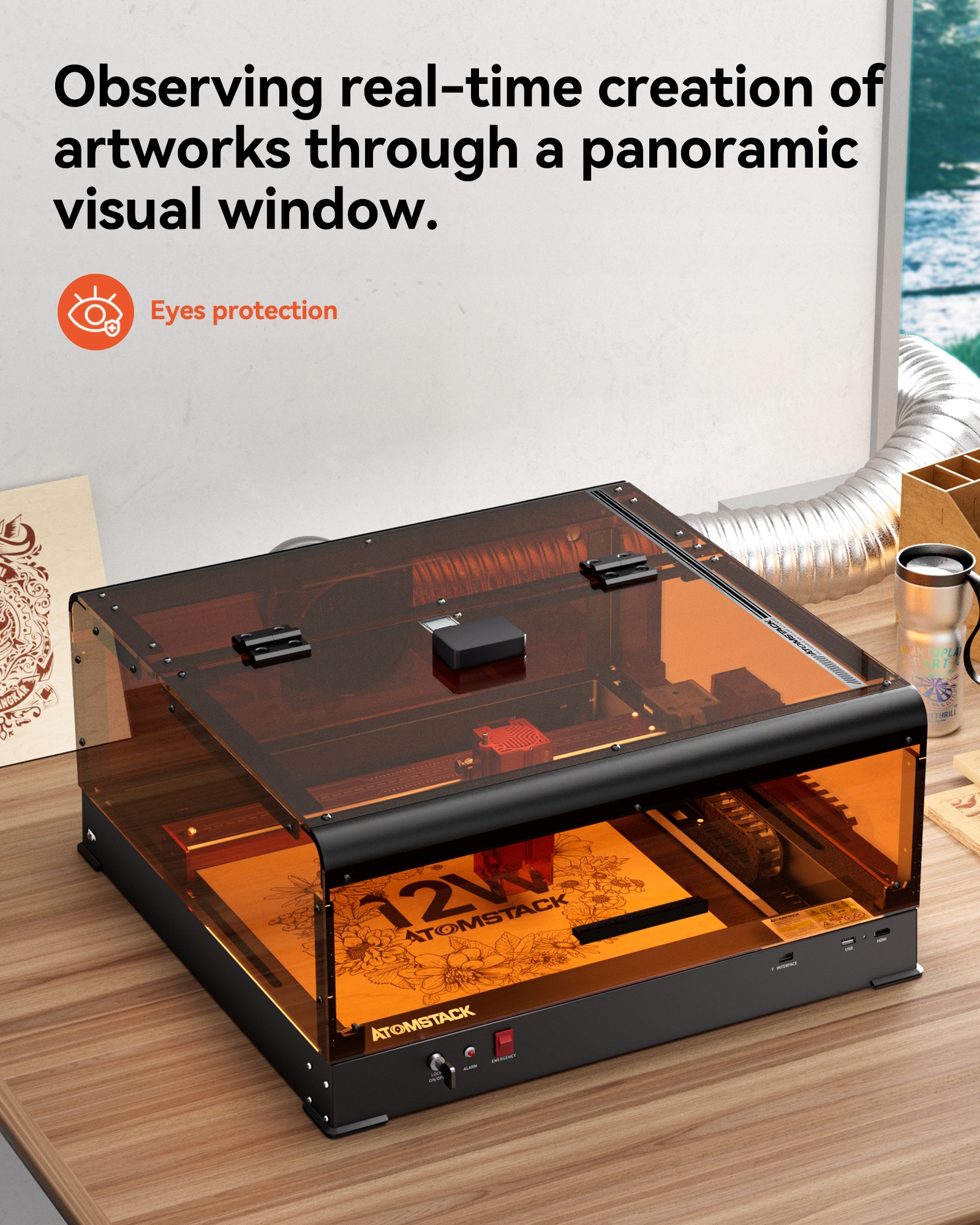 3. Прозрачный защитный чехол: из акрила, обеспечивающий полную видимость работы машины и обеспечивающий защиту от яркого света.