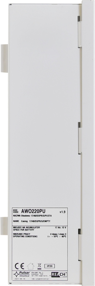 Pulsar AWO220PU 17/40/DSPR/S/PUSTA — металлический корпус накладного монтажа, предназначенный для установки панелей управления Satel и модули, Risco, DSC, Paradox, Pyronix, Crow, EBS, Telmor, Pulsar, Texecom, Roger внутри помещения (IP20).
