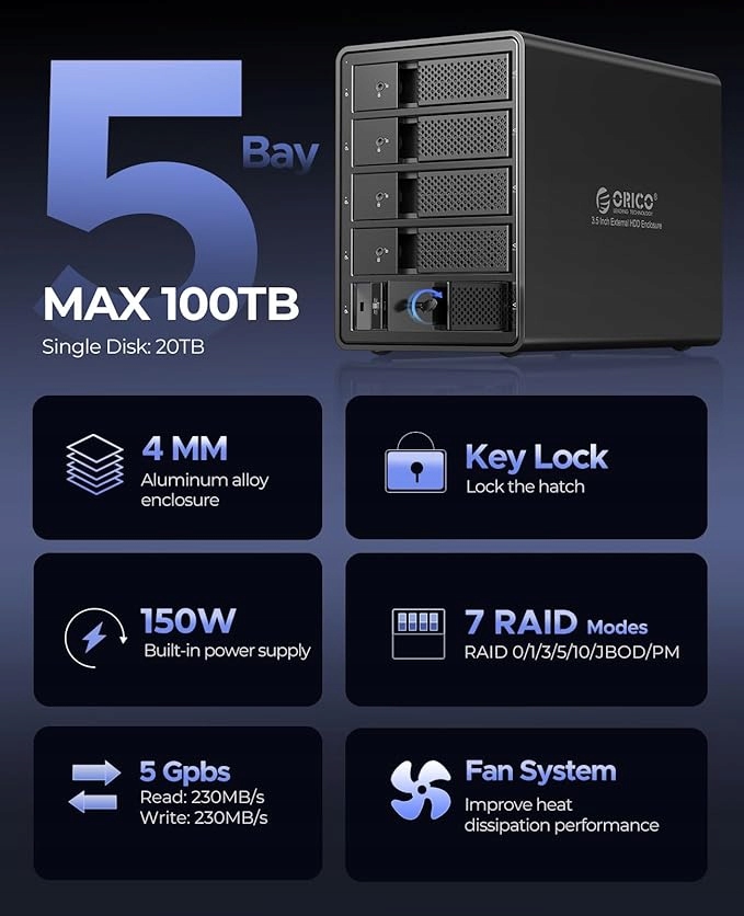 Док-станция с 5 отсеками Док-станция из алюминиевого сплава (3,5 дюйма) от ORICO, которая часто обрабатывает большие объемы данных и часто требует обширного резервного копирования, обеспечивает доступ к жестким дискам как для профессионалов, так и в домашнем офисе.