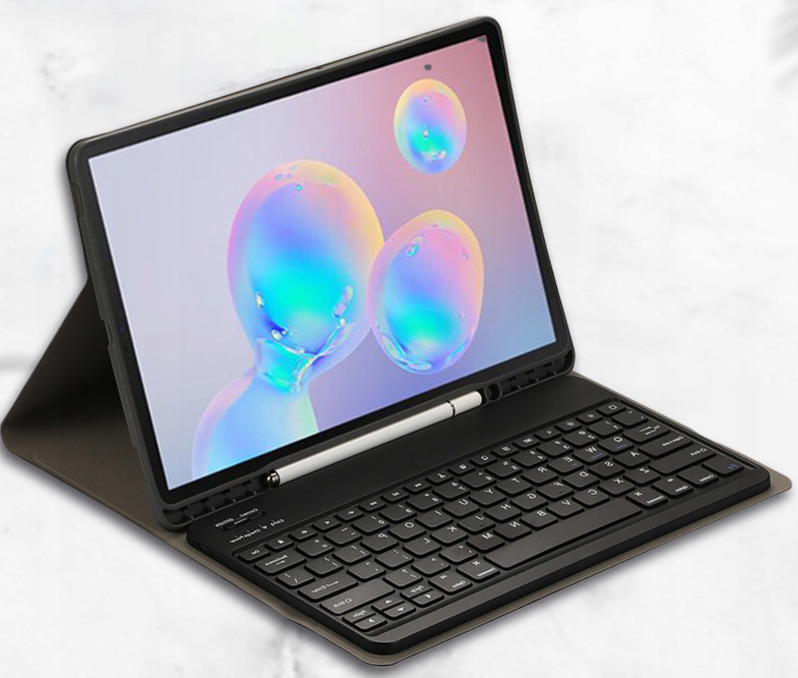 Чехол выполнен из очень прочной эко-кожи. Планшет и защита выглядят эстетично благодаря минимальной толщине корпуса. Наш планшет защищен на 100%. Вам не придется беспокоиться о царапинах или механических повреждениях. Кроме того, все слоты и кнопки открыты. Bluetooth-клавиатура очень высокого качества. Беспроводное соединение происходит мгновенно.