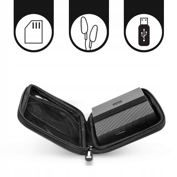 - Корпус закрыт с помощью молнии. Внутри вы можете найти небольшой сетчатый карман для, например, USB -кабель. Диск дополнительно закреплен с эластичной лентой для защиты на месте. Корпус сделан из прочного пластика.