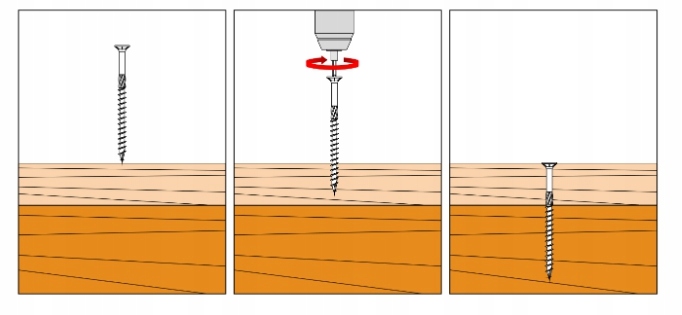 - Шурупы следует вкручивать непосредственно в деревянную основу, без предварительного сверления отверстий.