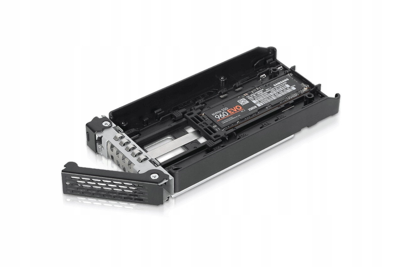 Чтобы установить твердотельный накопитель M.2 PCIe NVMe, просто поместите его в отсек для диска и затем сдвиньте крепежный адаптер — никаких инструментов или винтов не требуется.