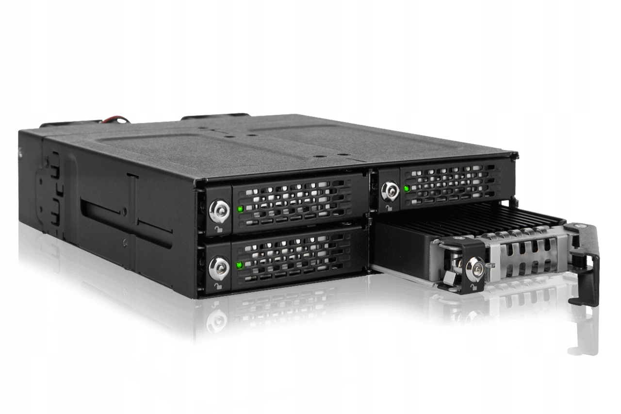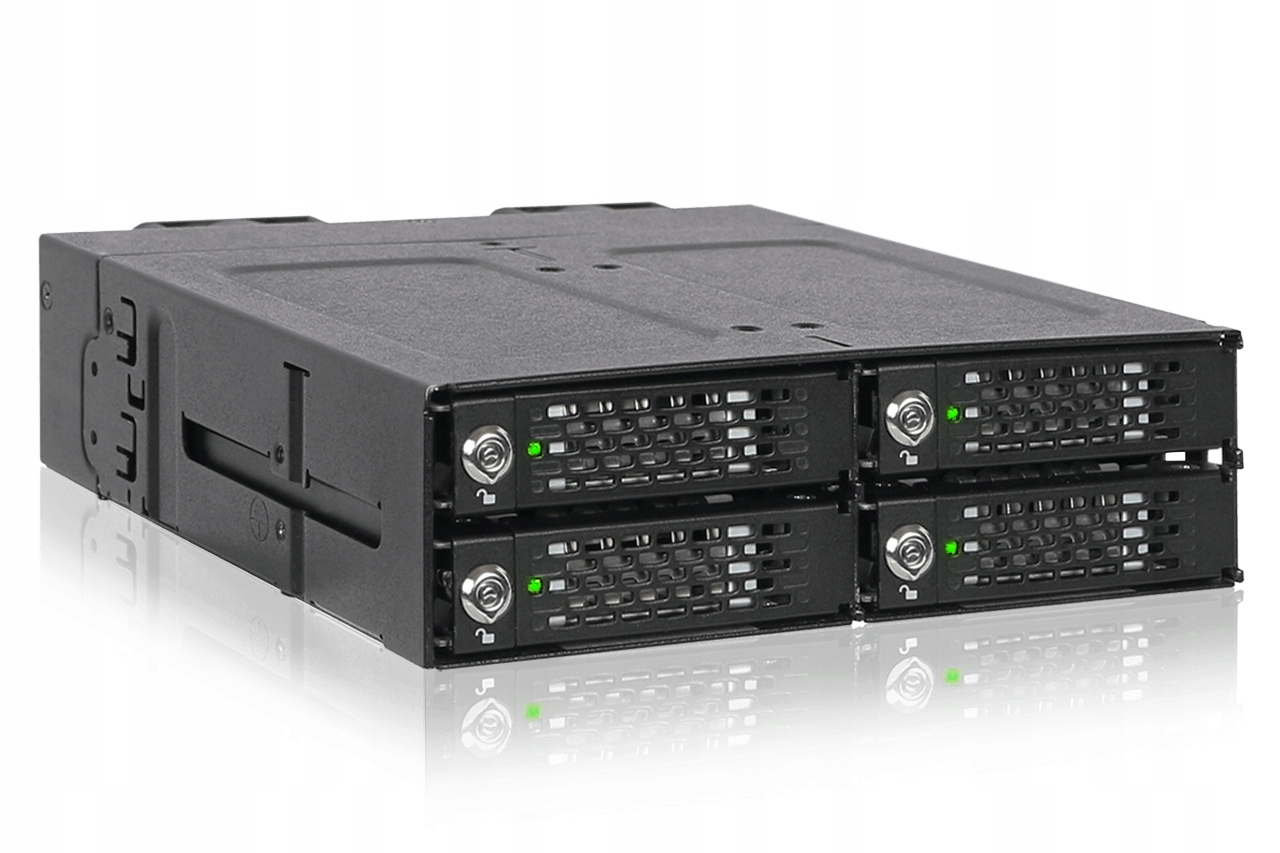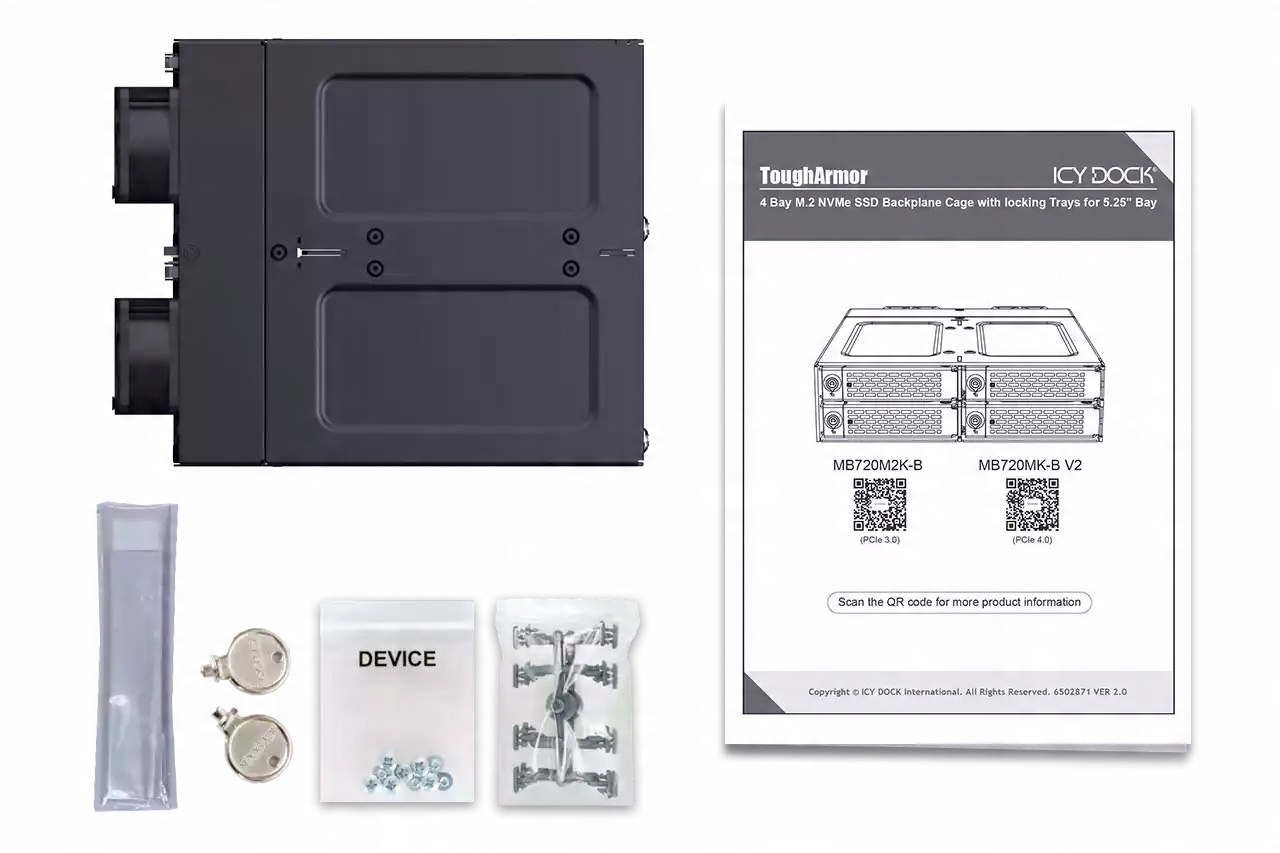 ToughArmor MB720MK-B V2 до Durable, док-станция с четырьмя отсеками для твердотельных накопителей M.2 PCIe 4.0 NVMe, которая помещается в один слот 5,25 дюйма. Благодаря использованию разъема SFF-8612 он обеспечивает скорость передачи до 64 Гбит/с, а использование специальных лотков ускоряет и облегчает замену носителей. Для обеспечения оптимальных рабочих температур MB720MK-B V2 оснащен двойной активной системой охлаждения и термопрокладками, установленными в отсеках для дисков. Модель MB720MK-B V2, являющаяся продуктом серии ToughArmor, отличается усиленной металлической конструкцией.