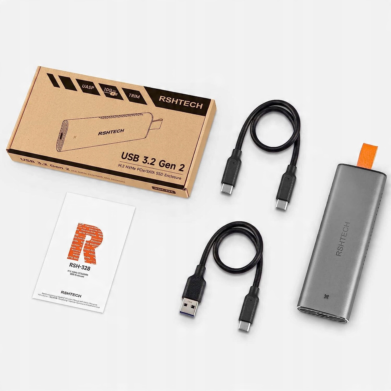 Адаптер RSHTECH NVMe M.2 SSD поддерживает USB 3.2 Gen2, UASP и Trim, скорость передачи данных до 10 Гбит/с. Встроенный чип Premium RTL9210B обеспечивает безопасную и сверхбыструю передачу данных. Два кабеля (тип C и тип A) также поддерживают скорость 10 Гбит/с. Перед покупкой подтвердите совместимость вашего жесткого диска. Фактическая скорость зависит от типа SSD и порта USB.