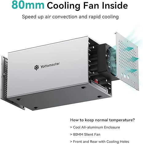 Корпус из алюминиевого сплава и тихий 80-мм вентилятор. Корпус SATA RAID с 4 отсеками, изготовленный из прочного алюминия. Корпус для отвода тепла, спереди и сзади, с охлаждающими отверстиями, 80-мм вентилятор с интеллектуальным контролем температуры внутри может эффективно ускорить конвекцию воздуха и быстрое охлаждение. Вентилятор автоматически регулирует свою скорость в зависимости от температуры жесткого диска, обеспечивая оптимальное охлаждение при низком уровне шума.