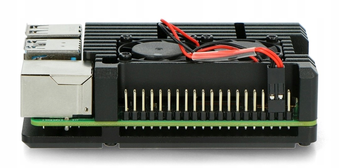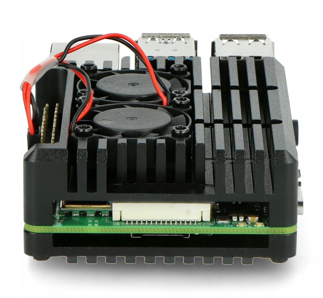 Полностью алюминиевый черный корпус для миникомпьютера Raspberry Pi 4B с двумя вентиляторами. Конструкция корпуса представляет собой один большой радиатор, благодаря чему после установки входящих в комплект термопрокладок он существенно охлаждает малину.