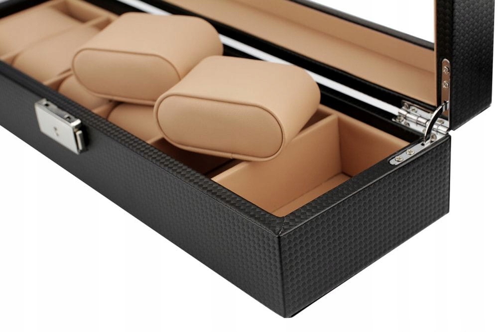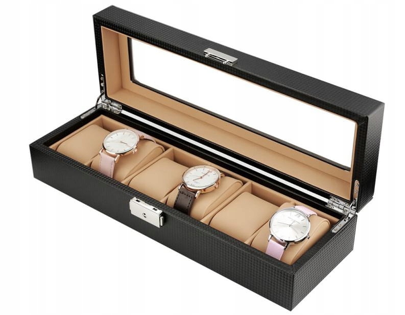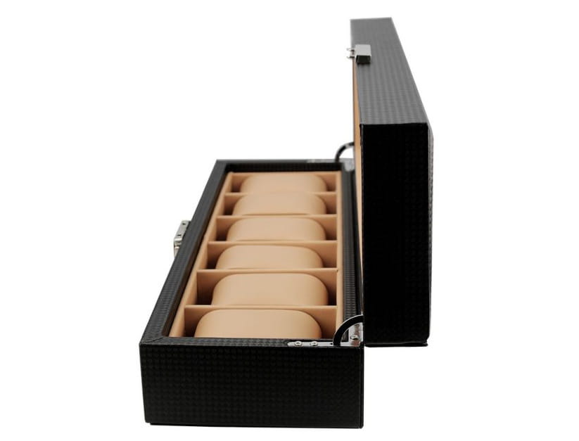 Очень стильная шкатулка для хранения или демонстрации часов, браслетов и подобных украшений. Своим появлением он обязан использованию материала, напоминающего Углерод.