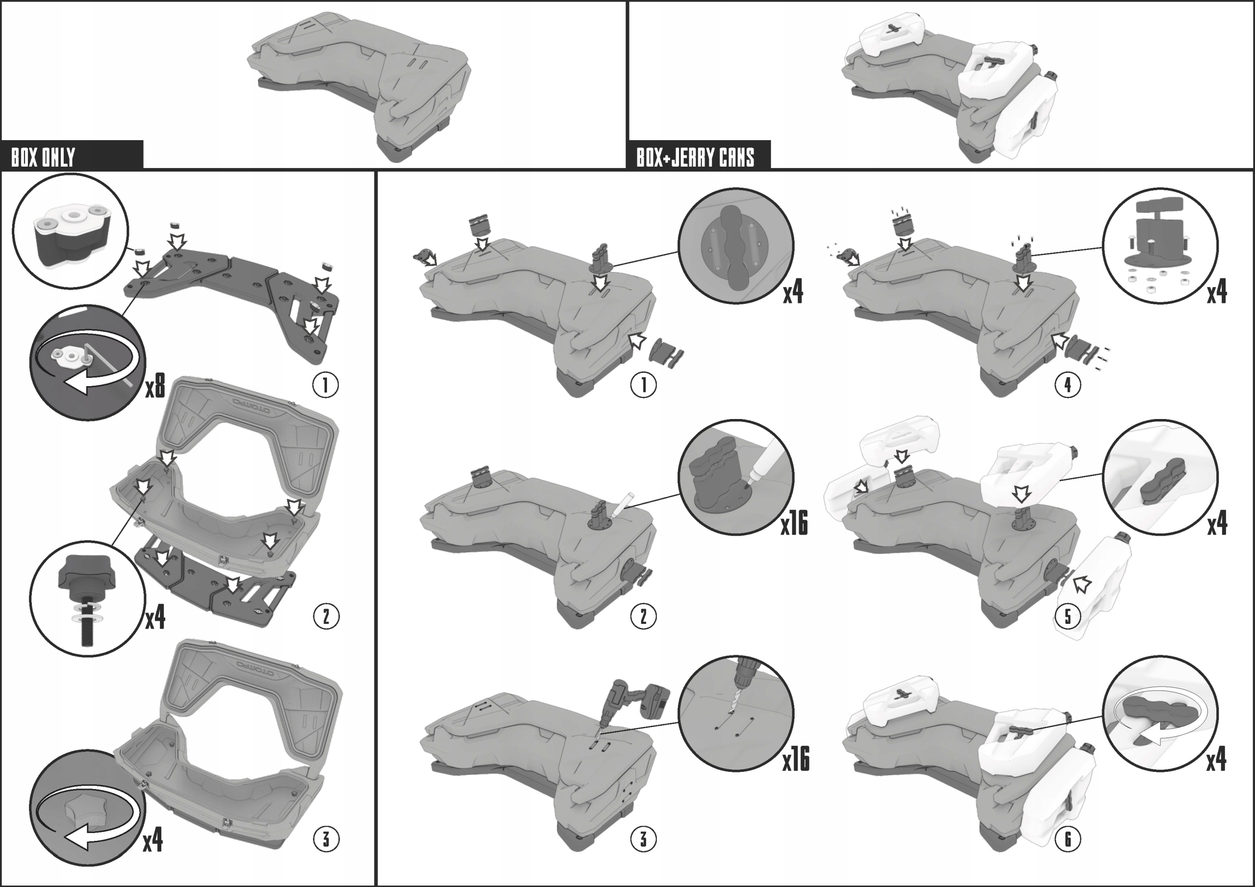 Кейс крепится с помощью быстросъемных соединителей, устанавливаемых в заводские отверстия багажника. К крышке можно прикрепить максимум 4 канистры GKA, предназначенные для этой модели.