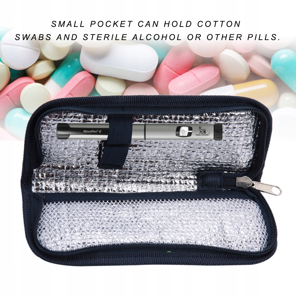 2. В этой сумке размещаются две ручки для инсулина, а в небольшом кармане вы можете хранить ватные шарики и стерильный спирт или другие таблетки.