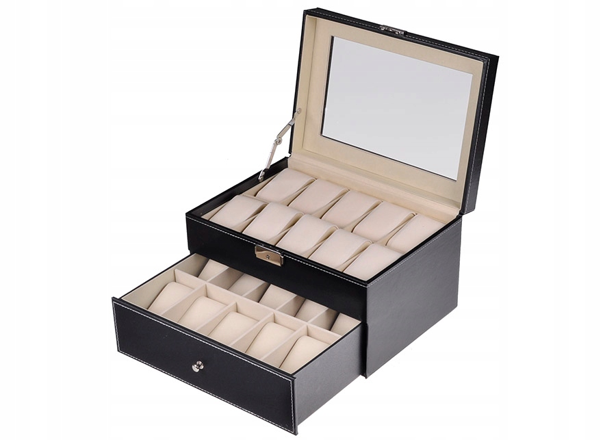 В коробке два уровня, на каждом из которых можно разместить 10 часов. Верхнее отделение открывается как классическая шкатулка и защищено металлической петлей – нижнее отделение представляет собой вместительный ящик, который, когда он пуст (внутренняя часть съемная), можно использовать и для хранения других вещей. Нижний ящик полностью съемный, что позволяет содержать его в чистоте и порядке!
