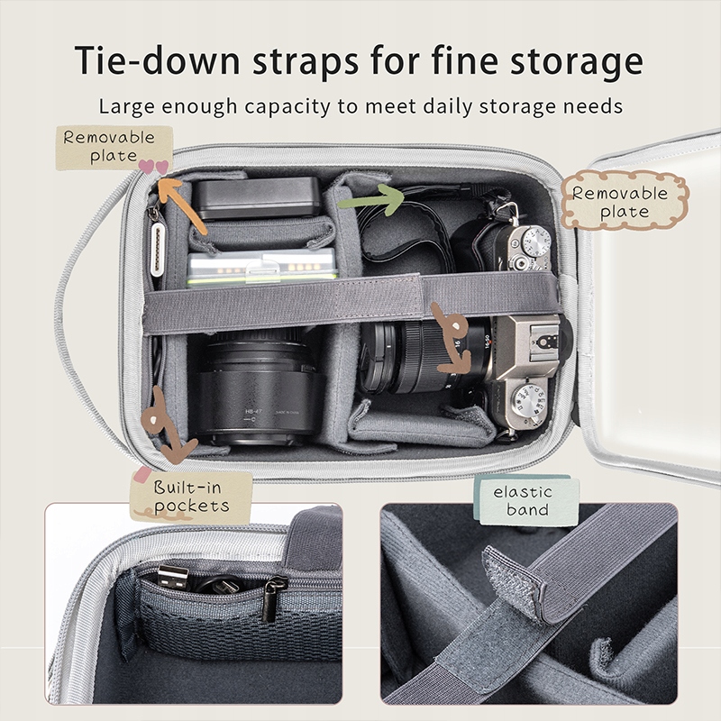 DIY Doshy Design: Внутренняя часть использует 2*Long + 3*Короткие отсеки с пружинными полосками для настраиваемой стабильной сборки, подходящих для хранения и защиты различных объектов, включая электронику, такие как безразличные камеры и спортивные камеры. Защита: Внешний слой использует ПВХ (вверху, поднятый для уменьшения трения) и PU (внизу), с шикарным интерьером для амортизации. Предотвращает всплески, пыль, удар; Прочный, прочный и устойчивый к царапинам для аксессуаров для камеры.