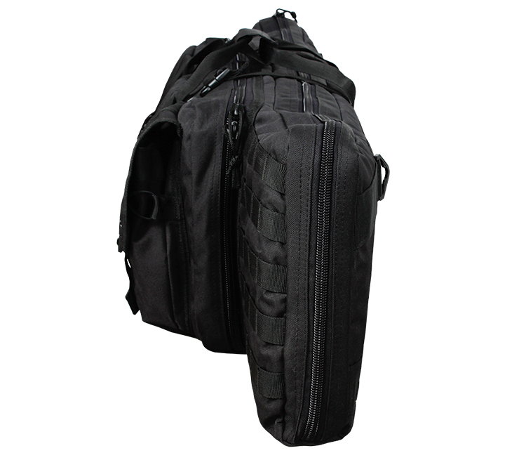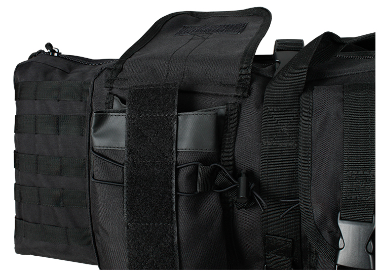 Основное отделение с двумя большими карманами (например, для амуниции) закрывается на сплошную молнию. Меньшее отделение для пистолета-пулемета содержит два жестких кармана (например, для магазинов и боеприпасов), закрывающихся липучками.