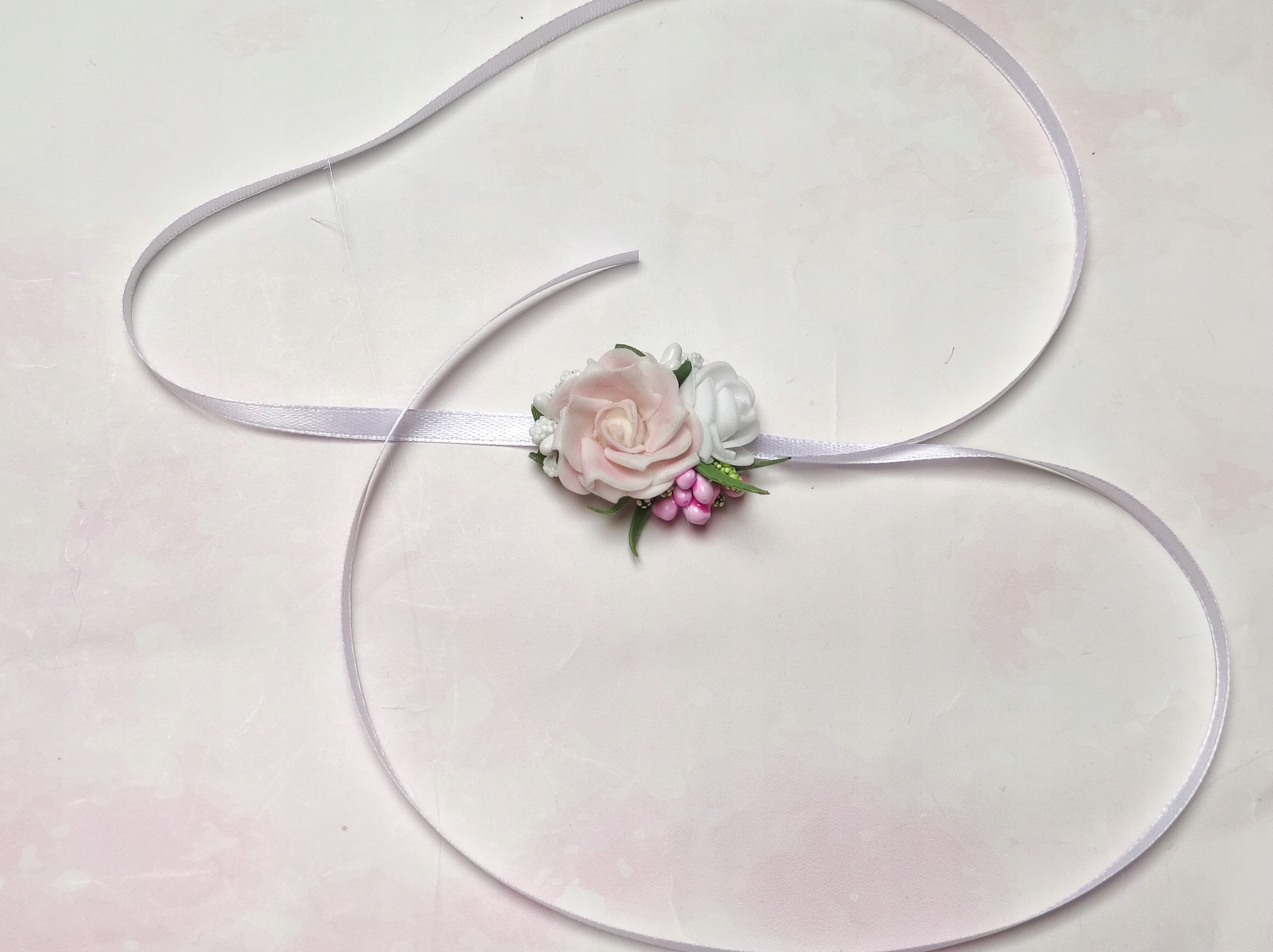 Корсар на руку рука перевязана на руке лентой. Цветы снизу защищены нежным фетром.