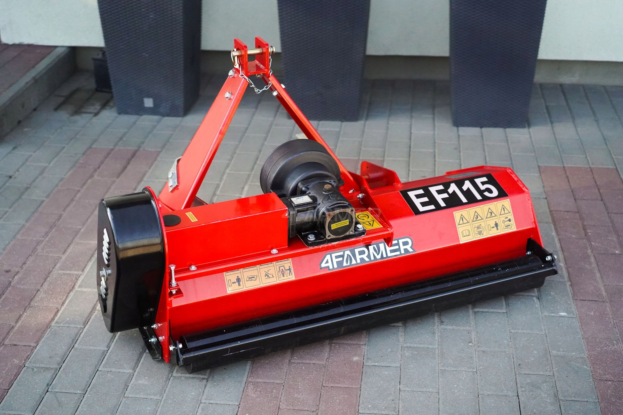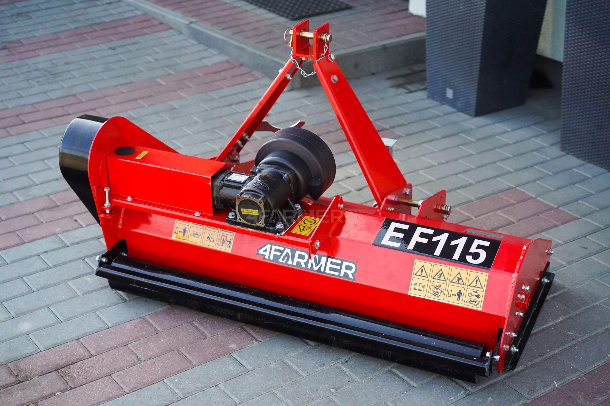 Цеповая косилка (мульчер) EF 115 4FARMER имеет ширину среза 115 см, при этом в предложении представлено семь вариантов ширины. Помимо цельного рабочего вала, оснащенного горизонтально расположенными измельчающими битами, косилка имеет еще задний (ведомый) вал. Он позволяет регулировать высоту среза и удерживать косилку на выбранной высоте. Привод от ВОМ трактора составляет 540 об/мин.