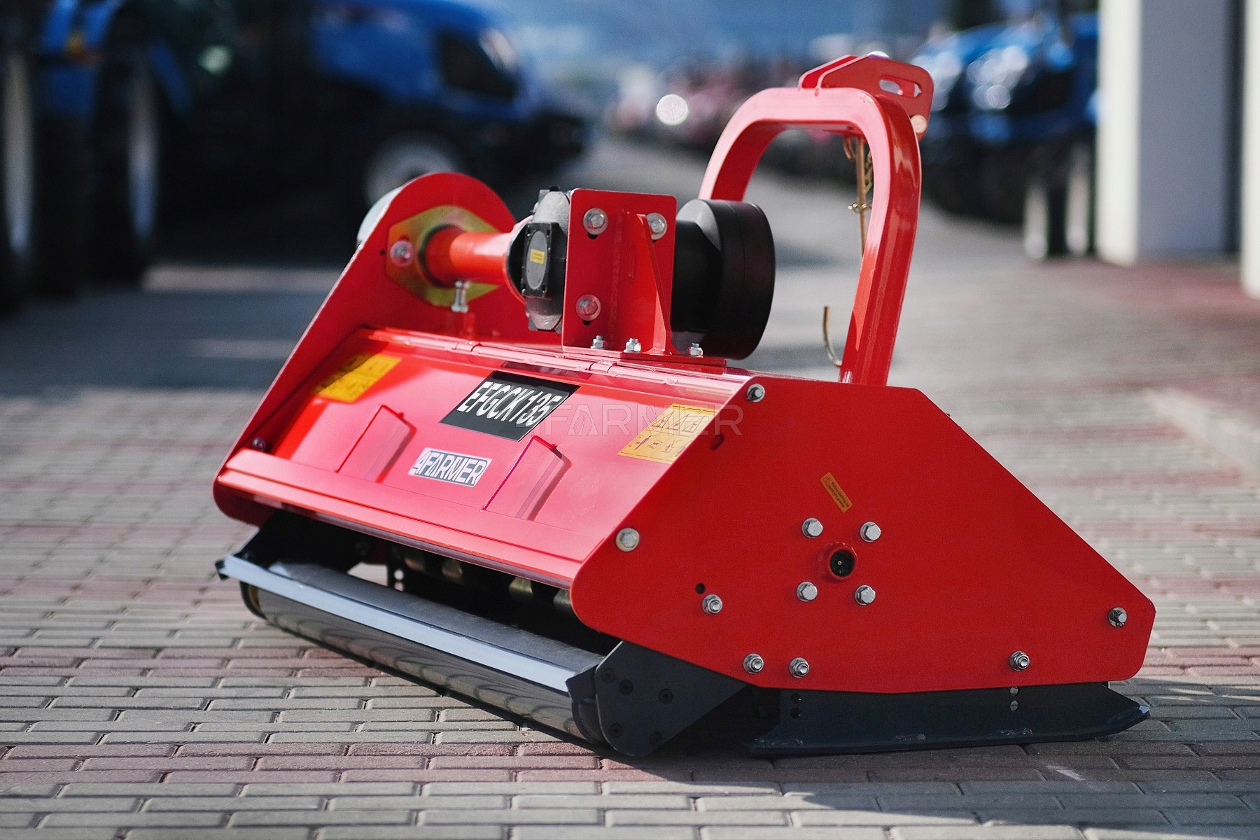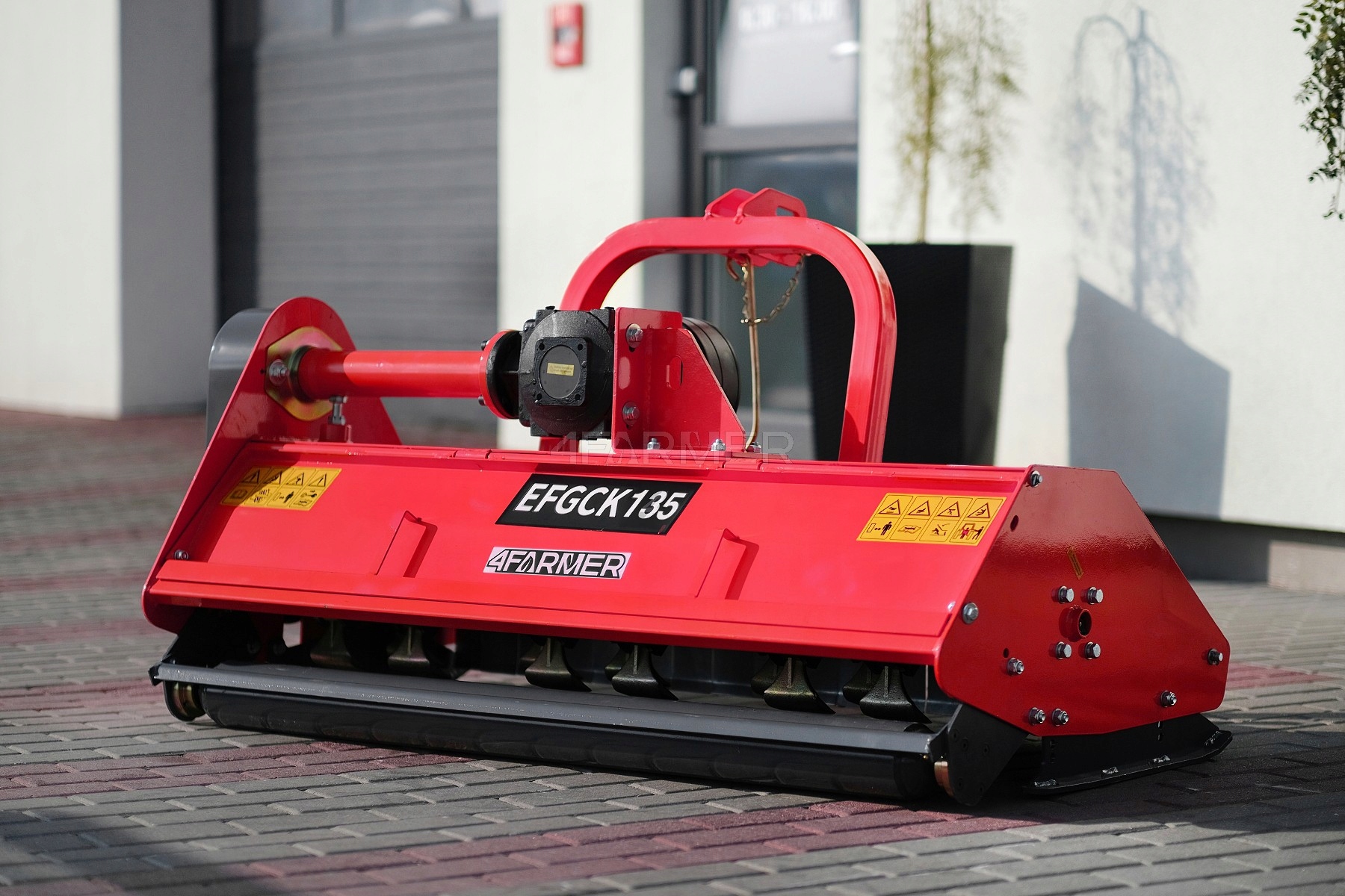 цеповая косилка (мульчер) EFGC-K 135 4FARMER имеет ширину скашивания 135 см, это промежуточная косилка среди восьми доступных по ширине. Помимо цельного рабочего вала, оснащенного горизонтально расположенными измельчающими битами, косилка имеет еще задний (ведомый) вал. Он позволяет регулировать высоту среза и удерживать косилку на выбранной высоте. Привод от ВОМ трактора — 540 об/мин.